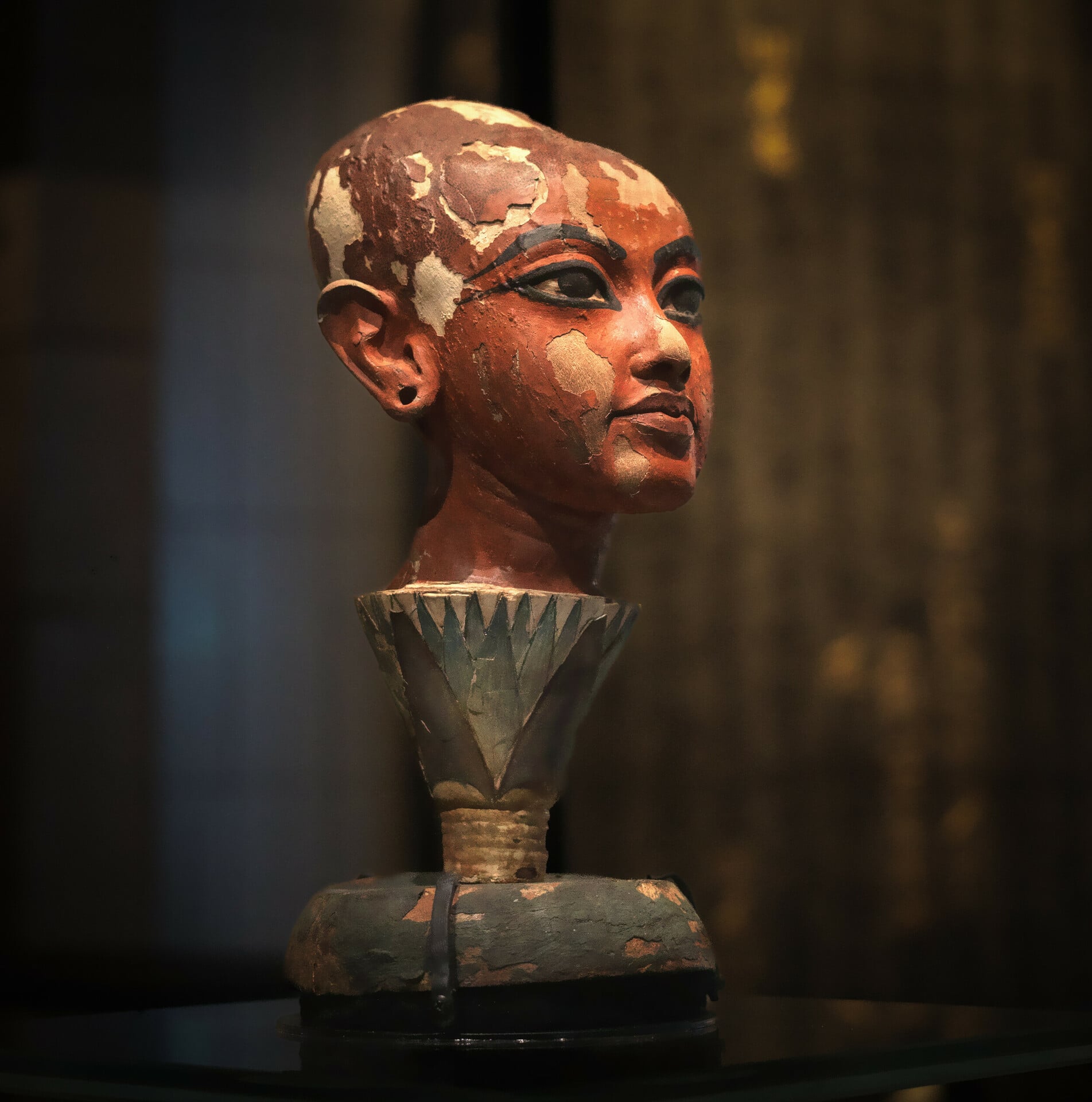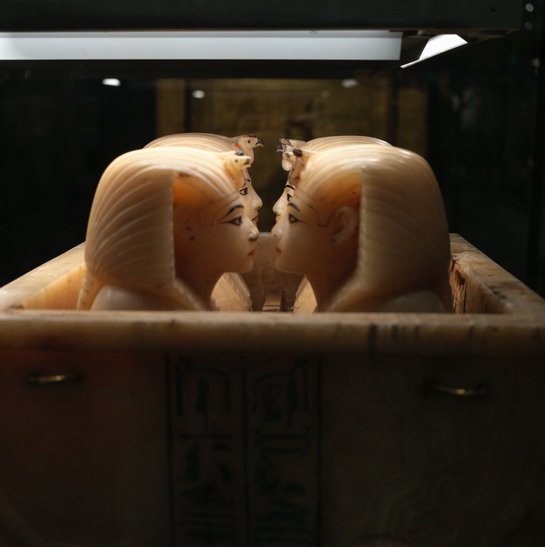 Και ξαφνικά, μέσα στον τόσο πλούτο και την απαράμιλλη χλιδή, ένα κασελάκι από συκομουριά επιχρισμένο με υπόλευκο γύψο. Καμία διακόσμηση. Σαν μπαούλο ενός ταπεινού ελληνικού σπιτιού, τη δεκαετία του '50. Ωστόσο ανήκε στον Φαραώ – βρέθηκε μέσα στον τάφο του. Θα το χρησιμοποιούσε ο ίδιος, για να του το μεταφέρουν, αλλιώς θα του έφερναν κάτι πολυτελέστερο. Ίσως φύλαγε σε αυτό τ' αγαπημένα του σανδάλια, τα λινά του ρούχα, κάτι προσωπικό οπωσδήποτε. Δεν θα μάθουμε ποτέ. Για να συντηρηθεί όπως το βλέπετε, ίδρωσαν. Ο γύψος έχει την τάση να ξεφλουδίζει (όπως φαίνεται στις γωνίες της φωτογραφίας). Οι συντηρητές του GEM χρησιμοποίησαν ειδικά ενέσιμα υλικά για να στερεώσουν το λευκό επίχρισμα πάνω στο ξύλο, εξασφαλίζοντας ότι θα παραμείνει άθικτο για τις επόμενες γενιές.