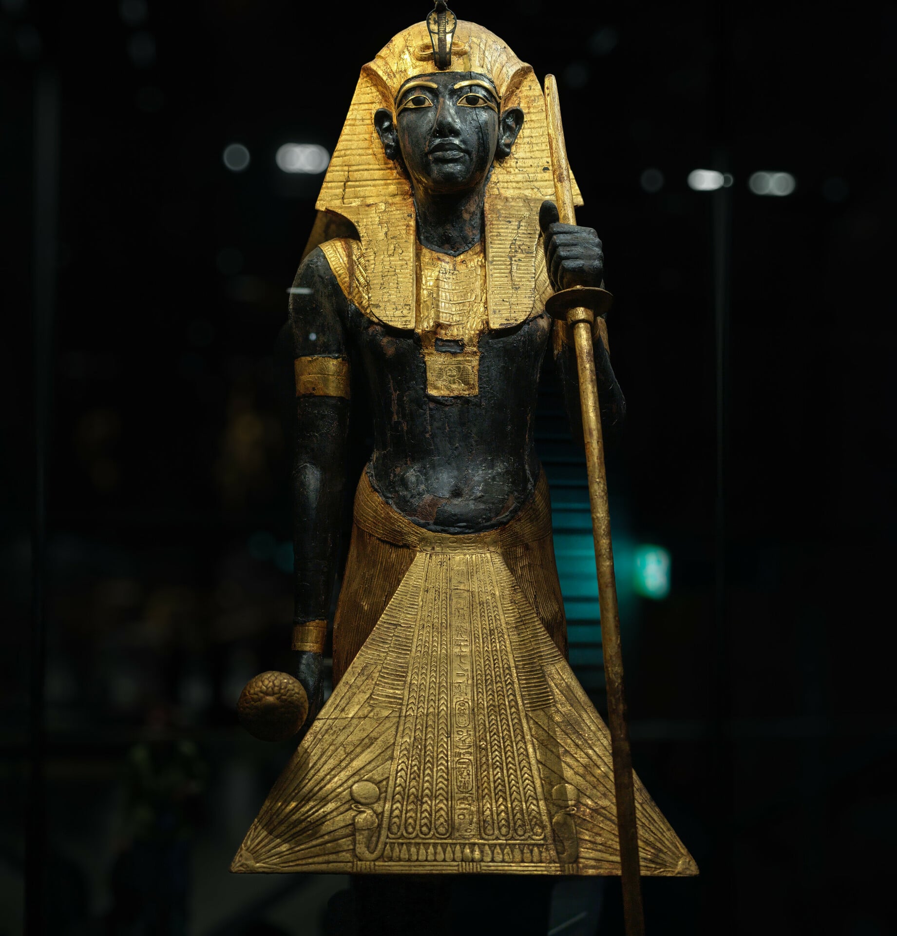 Ένας από τους δύο φύλακες που βρέθηκαν στον προθάλαμο του τάφου του νεαρού Φαραώ στην Κοιλάδα των Βασιλέων. Μαύρη ρητίνη και φύλλα χρυσού καλύπτουν το ξύλο. Το πόδι προτεταμένο, σε κίνηση, υποδηλώνει τη ζωή, όπως και το μαύρο χρώμα που συμβολίζει τα εύφορα λασποχώραφα του Νείλου. Αυτά τα αγάλματα θεωρείτο ότι έχουν εμφυσηθεί από το Ka (την πνευματική δύναμη) του Τουταγχαμών, για να τη φυλάξουν στον άλλο κόσμο.