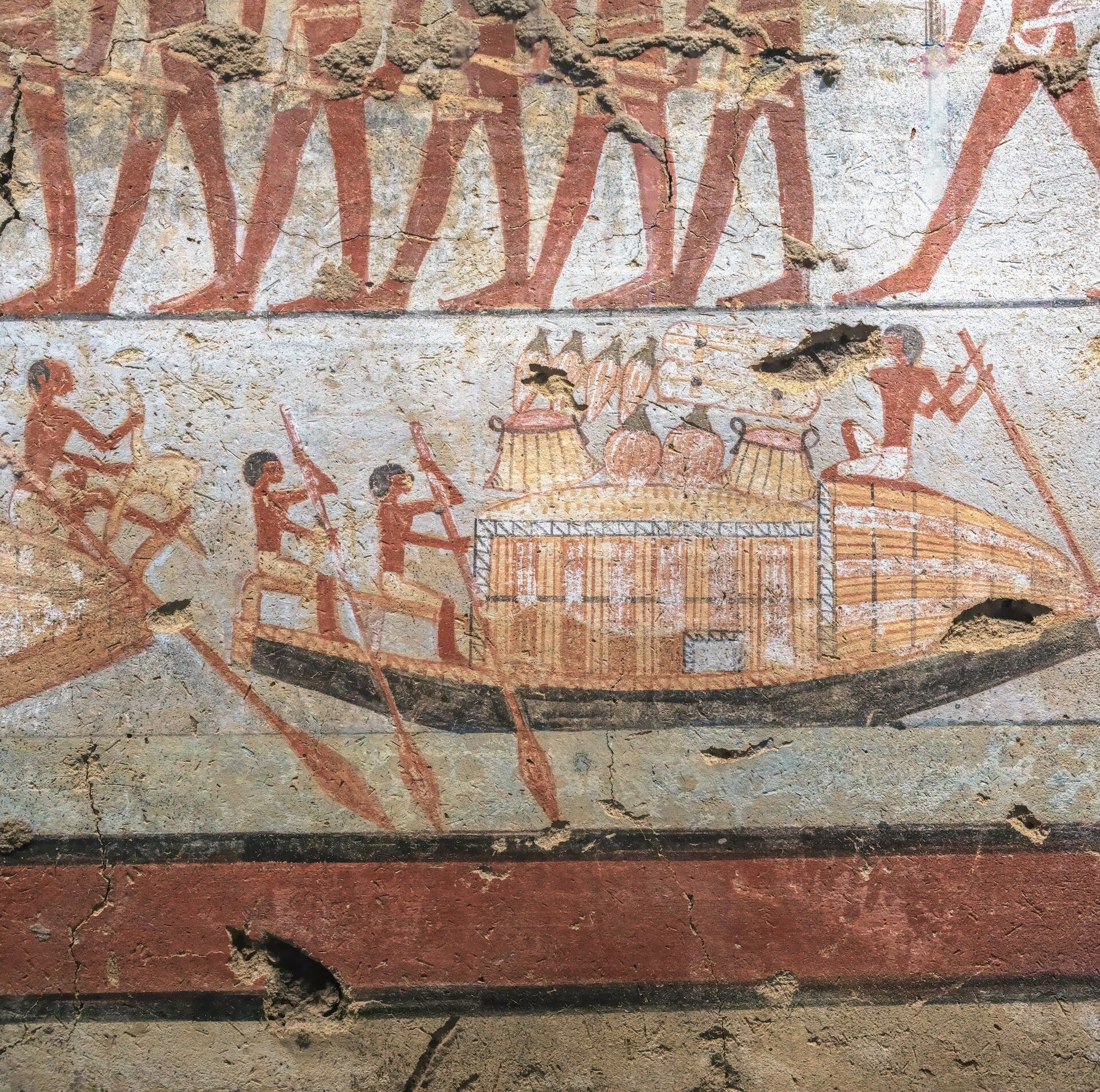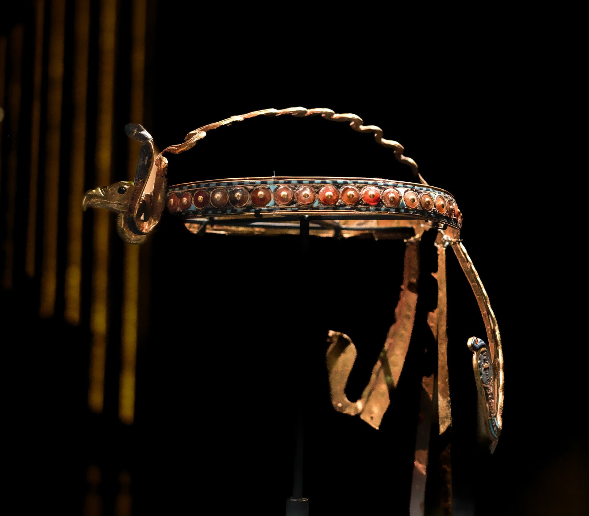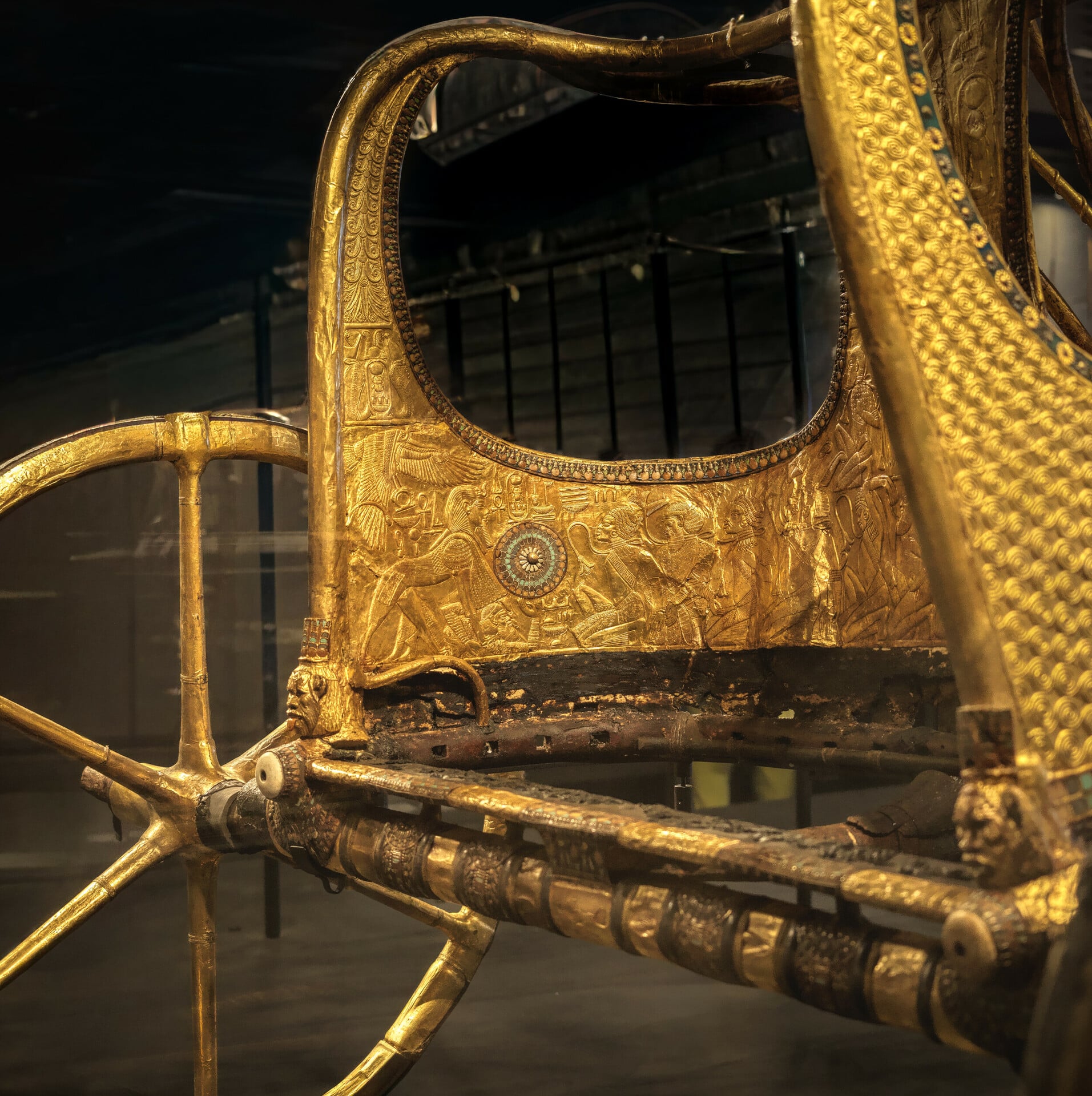 Noύβιοι εχθροί δεμένοι απ' τον λαιμό στο ανάγλυφο χρυσάφι αυτού του μάλλον πολεμικού άρματος του βασιλιά. Η συντήρησή αυτών των αρμάτων από το GEM ήταν μία από τις πιο λεπτές επιχειρήσεις στην ιστορία της αρχαιολογίας. Οι συντηρητές χρησιμοποίησαν νανο-υλικά για να στερεώσουν τα φύλλα χρυσού στο ξύλο, το οποίο είχε συρρικνωθεί με τους αιώνες, αποτρέποντας έτσι την αποκόλλησή τους.