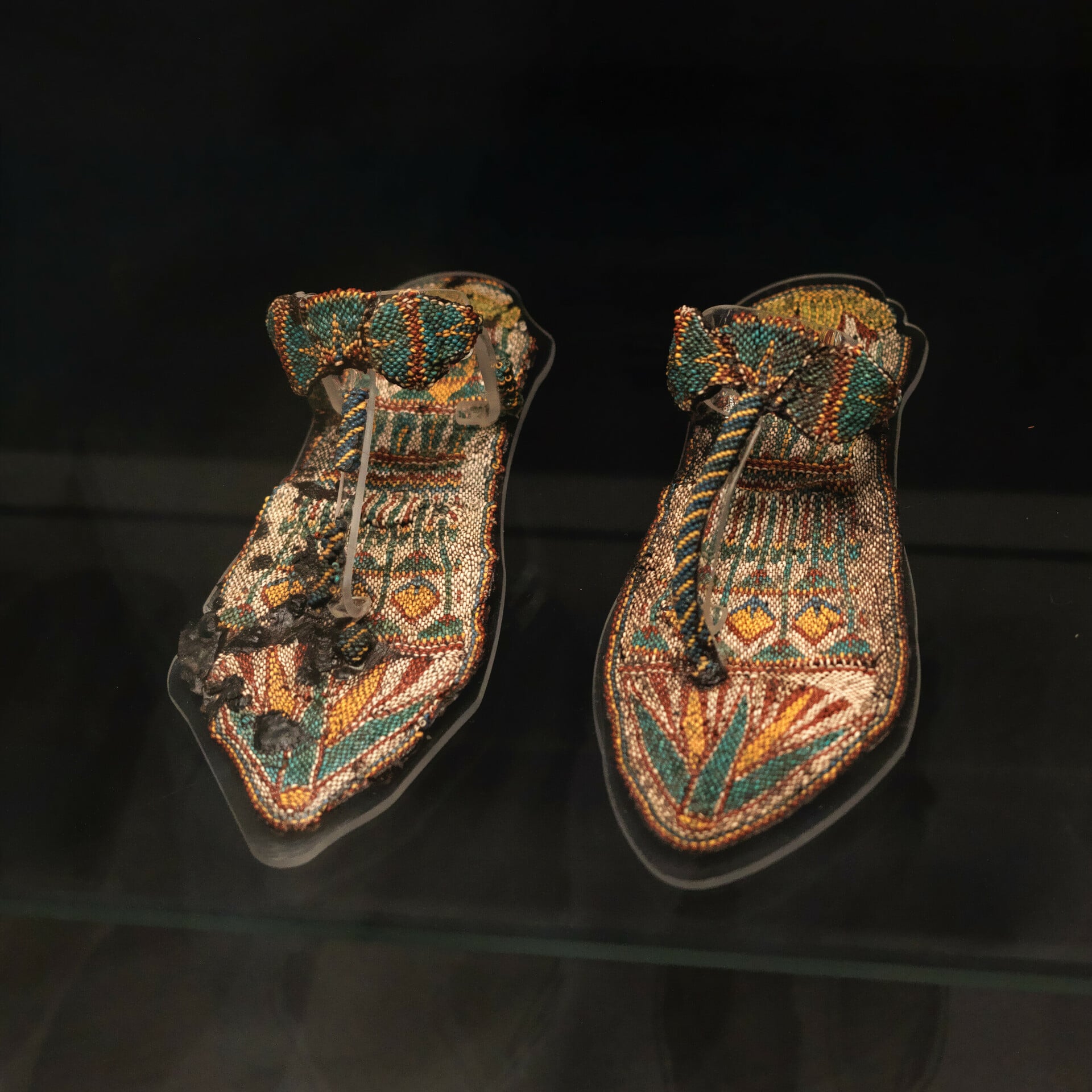 Στον τάφο του Τουτ βρέθηκαν πάνω από 80 ζευγάρια σανδάλια με σημάδια χρήσης τα πιο πολλά, αλλά αυτό ήταν το εντυπωσιακότερο. Γεωμετρικά και ανθοκεντρικά μοτίβα με τιρκουάζ και κίτρινα χρώματα ― αποτελούν ταυτόχρονα ένα σπουδαίο κατόρθωμα των συντηρητών του GEM. Τα σανδάλια με πάτο από δέρμα ή πάπυρο, μετά από 3.300 χρόνια, είχαν γίνει εξαιρετικά ξηρά, οποιαδήποτε αλλαγή στην υγρασία μπορούσε να τα θρυμματίσει. Ο μέγιστος πονοκέφαλος ήταν ωστόσο οι χιλιάδες μικροσκοπικές γυάλινες χάντρες. Το νήμα που τις κρατούσε ενωμένες είχε λιώσει προ πολλού, με αποτέλεσμα να συγκρατούνται στη θέση τους σχεδόν «από θαύμα» ή με ειδικές στερεωτικές ουσίες. Μεταφέρθηκαν στο νέο μουσείο ως ιερός ιστός αράχνης, σε ειδικούς δίσκους που απορροφούσαν πλήρως τους κραδασμούς. Τώρα εκτίθενται (όπως πολλά άλλα εκθέματα) σε προθήκη με άζωτο αντί για απλό αέρα, που αποτρέπει τη χημική αποσύνθεση των υλικών.