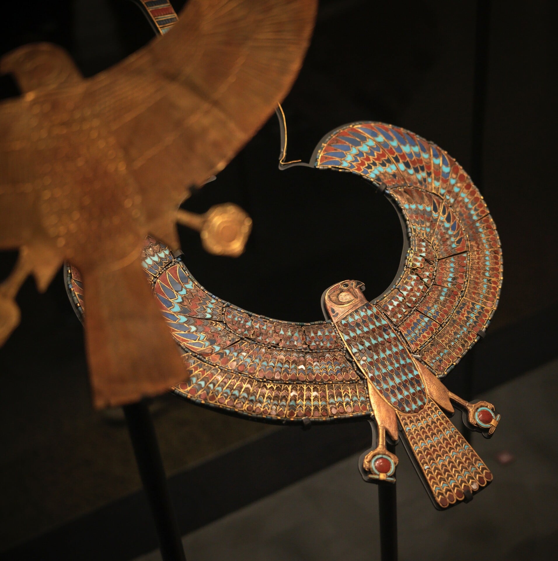 Όταν ο Howard Carter και η ομάδα του άρχισαν να ξετυλίγουν τους λινούς επιδέσμους της μούμιας (οι οποίοι ήταν ποτισμένοι με ρητίνες, σκληροί σαν πέτρα), ανακάλυψαν πάνω από 140 αντικείμενα και κοσμήματα τοποθετημένα σε διαφορετικά στρώματα. Αυτό το περιδέραιο με τον γερακίσιο θεό Ώρο, από σμάλτο, λάπις λάζουλι και πορτοκαλοκόκκινο κορνεόλη ήταν τοποθετημένο ακριβώς πάνω στο στήθος του Τουταγχαμών, να προστατεύει την καρδιά και την ανάσα του στην αιωνιότητα. Στα γαμψά του νύχια κρατά τον κύκλο του Shen, σύμβολο αιωνιότητας. Οι φτερούγες καμπυλώνονται σαν χέρια, να αγκαλιάσουν τον έρημο νεκρό στο μεταφυσικό ταξίδι του.