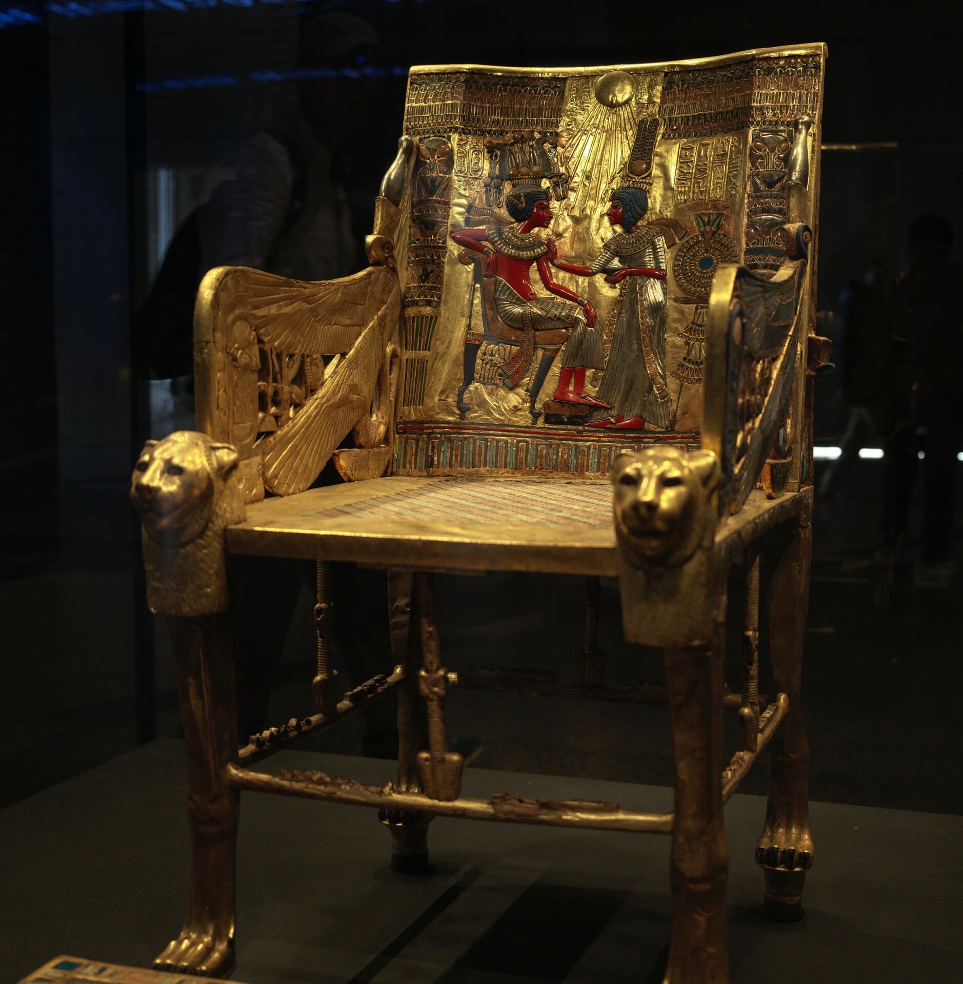 Ένα αριστούργημα. Ο χρυσός θρόνος του Τουτ. Αλλά κυρίως μια τρυφερή σκηνή ενός άντρα και μιας γυναίκας. Εδώ δεν υπάρχει εξουσία· μόνο ο κλειστός δεσμός του ζευγαριού. Η βασίλισσα Ανχεσεναμούν αλείφει τον ώμο του Τουταγχαμών με κάποιο αρωματικό έλαιο, φορούν μόνο ένα σανδάλι ο καθένας (ίσως συμβολισμός ότι μοιράζονται τα πάντα), φτερωτές κόμπρες στα πλαϊνά και δυο λιοντάρια στα μπράτσα κρατάνε τους εχθρούς μακριά, για να επιτελεστεί η αγάπη. Πάνω από το ζευγάρι δεσπόζει ένας ήλιος με ακτίνες, στην άκρη κάθε ακτίνας φυτρώνει ένα χέρι μικρό, παιδιάστικο (δεν ξέρω αν το διακρίνετε), που κρατάει το σύμβολο Ankh, την ανάσα της αιώνιας ζωής. Ένα υπέρλαμπρο έργο, κι όμως μυστήρια απτό και ανθρώπινο – πράγμα που σπάνια συναντάς στην τέχνη της αρχαίας Αιγύπτου.