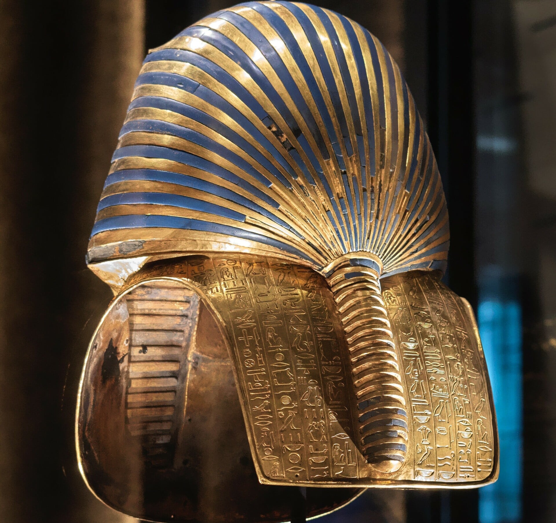 Κάτι που σπάνια βλέπουμε στις φωτογραφίες του Τουταγχαμών είναι η πίσω πλευρά της μάσκας. Εδώ είναι χαραγμένο ένα κείμενο από το Κεφάλαιο 151Β του «Βιβλίου των Νεκρών». Αυτό το κείμενο λειτουργούσε ως ένας «μαγικός κώδικας» που ταύτιζε κάθε σημείο της μάσκας με έναν θεό (π.χ. «το μέτωπό σου είναι ο Άνουβις», «τα μάτια σου είναι η βάρκα του Ήλιου»). Σκοπός ήταν το πνεύμα του βασιλιά να μπορέσει να αναγνωρίσει το σώμα του νεκρού και να επιστρέψει μέσα του.