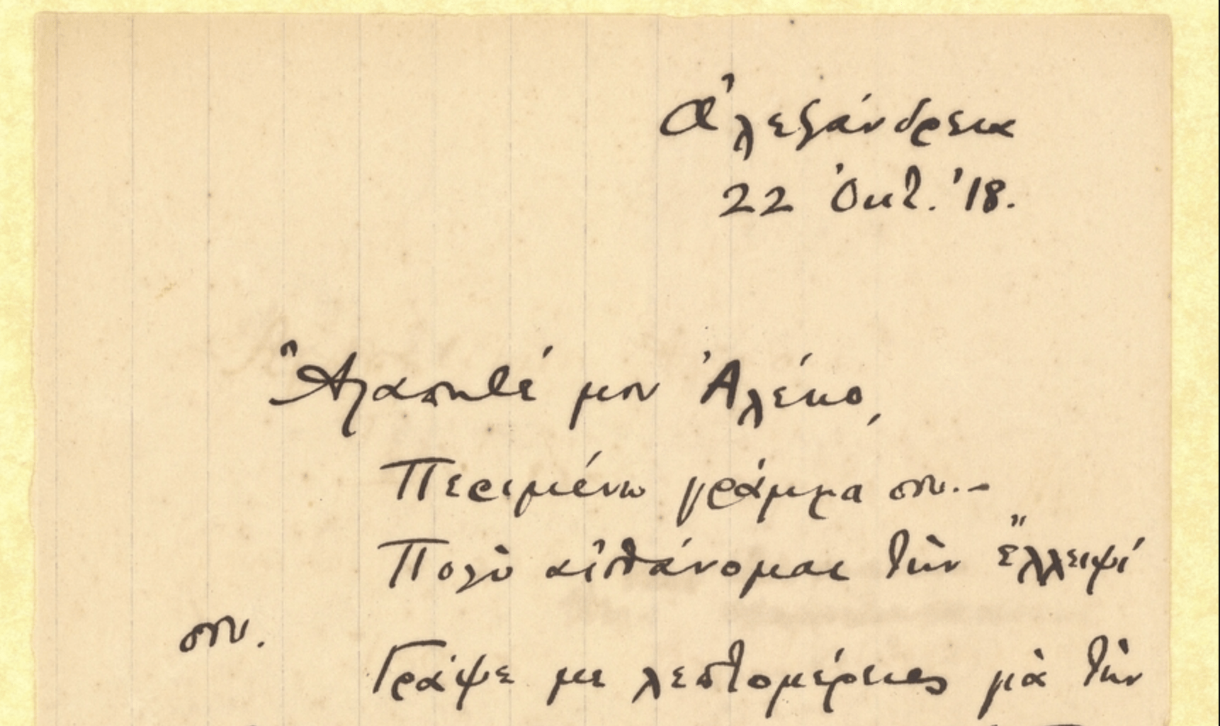 Τι σώματα, τι μαλλιά, τι πρόσωπα, τι χείλη! Λίγο έμειναν, κ’ πήγαν· κ’ εγώ ο τεχνίτης θάρρεψα πως κάτι έκαμνα φυλάγοντας μιαν ηχώ. Την οποίαν τώρα βρίσκω μικρό πράγμα κ’ κατά πάσαν πιθανότητα άχρηστον. Η ποιητικότις η μόνη διάβηκε προχθές εμπρός στα μάτια μου, ήταν η εμορφιά των δυο αγοριών. (17 Οκτωβρίου 1911)