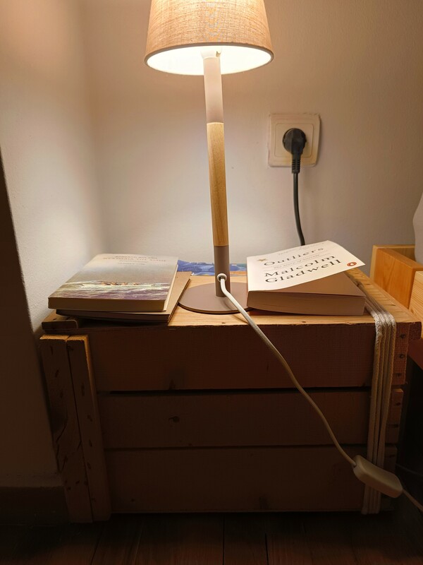 Το κομοδίνο μου είναι ένα παλιό ξύλινο κουτί, φτιαγμένο από σανίδες, δεμένο με σπάγκο στη μία άκρη. Το βρήκα στα σκουπίδια. Δεν ξέρω σε τι χρησιμευε ή τι περιείχε. Το πήρα επειδή ταίριαζε με το σχέδιο και το χρώμα του κρεβατιού. Το καθάρισα καλά, αν και δεν μύριζε. Έχει επάνω μόνο ένα μικρό πορτατίφ της πλάκας και τα βιβλία που διαβάζω κάθε φορά. Στην προκειμένη περίπτωση, τη "Νυχτωδια της Χιλής" του Μπολανιο, το "Outliers" του Gladwell και τη "Θεωρία της Ημιμόρφωσης" του Αντόρνο.