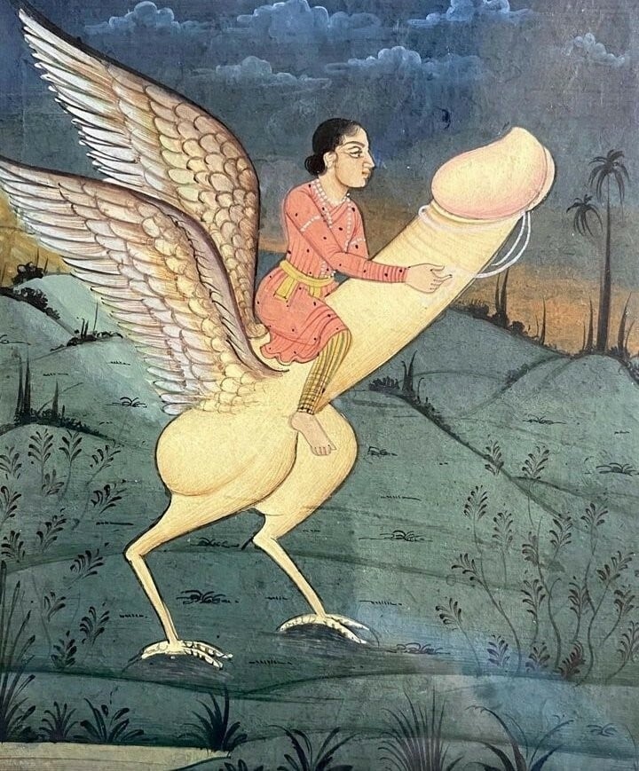 Λεπτομέρεια από τέμπερα σε χαρτί που δείχνει γυναίκα να καβαλάει τεράστιο φτερωτό πέος.