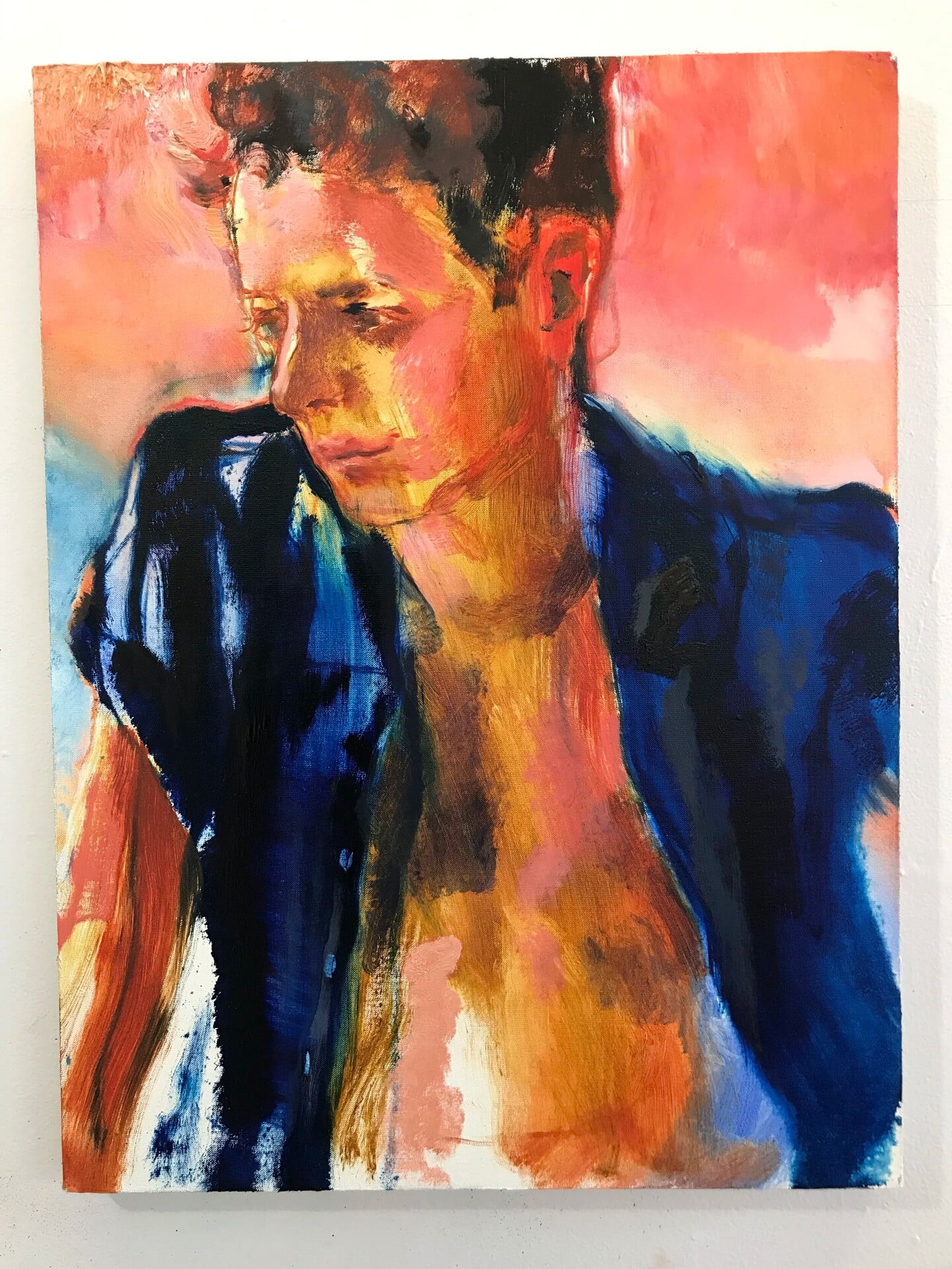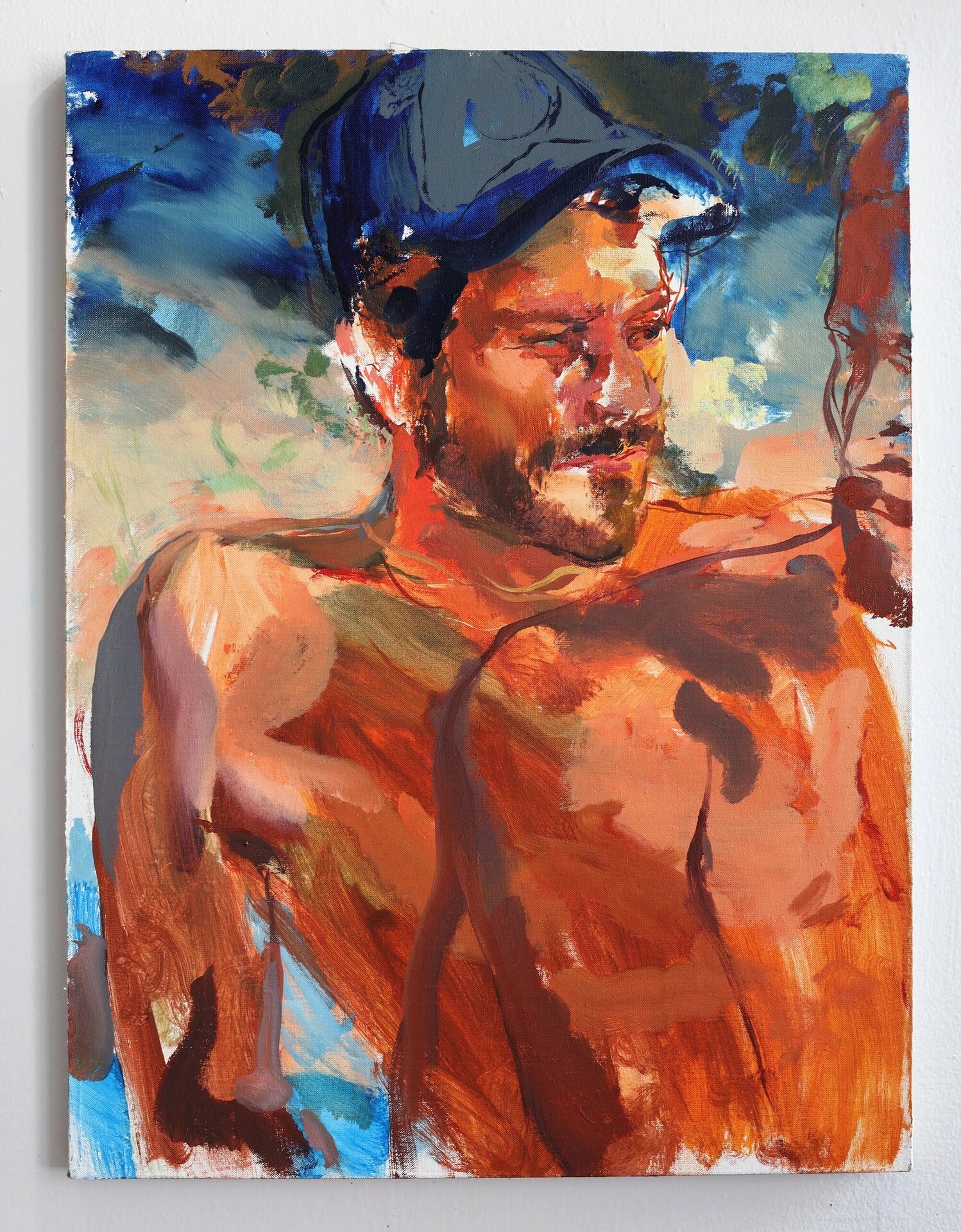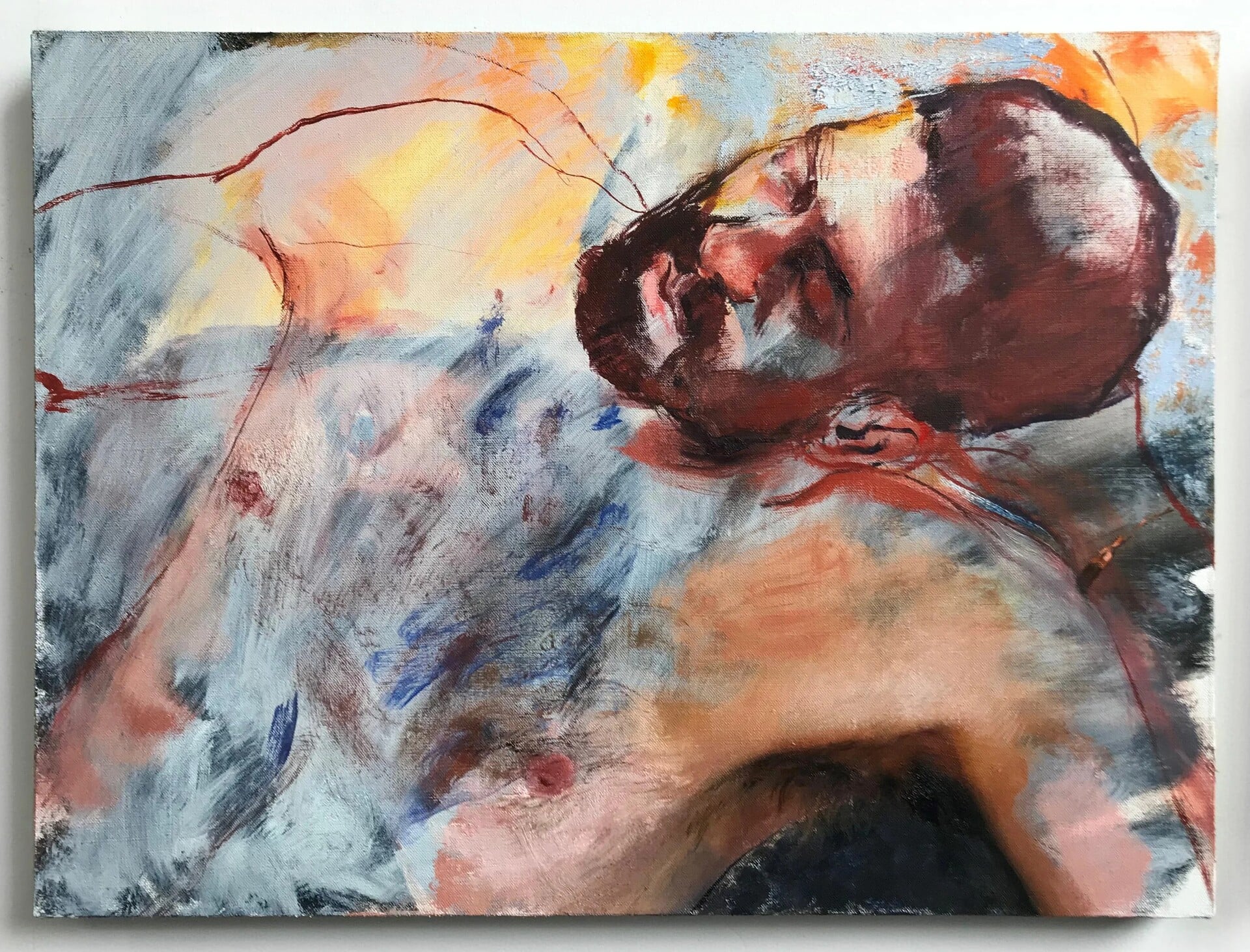 Το έργο του έχει συχνά έναν απαλό θόρυβο: το πρόσωπο του άντρα που αγαπά, μια μέση που λυγίζει στο φως, ένας μηρός που γίνεται χρώμα και μετά ξανά σώμα. Εκεί συναντάς το queer όχι ως ταυτότητα, αλλά ως τρόπο αφήγησης· ως ρευστή γειτνίαση με τον κόσμο. Μια συγγένεια που δεν διεκδικεί εξήγηση. Μόνο παρουσία.