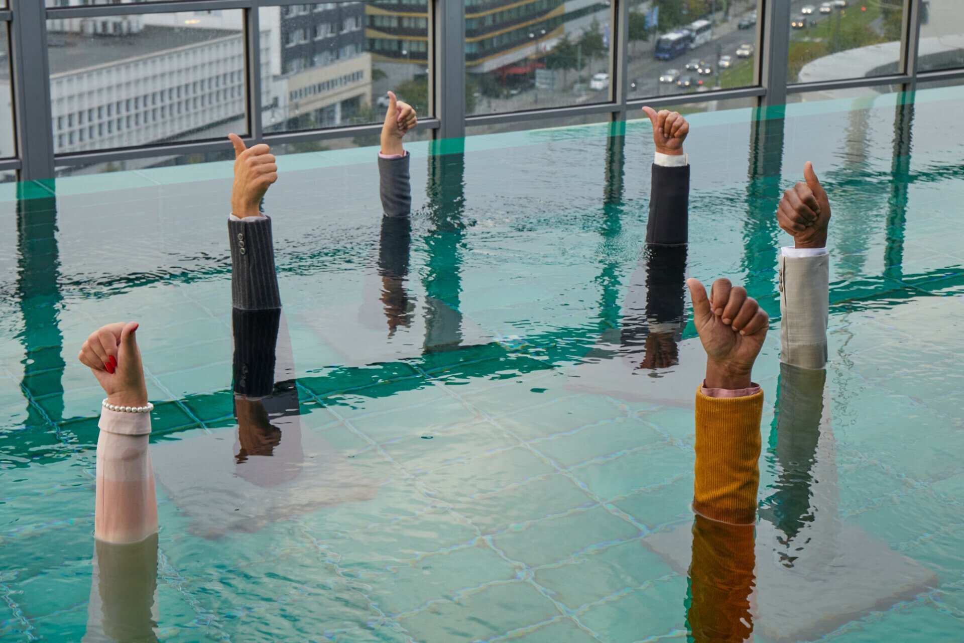Στο Don’t Worry Be Happy, τα βυθισμένα χέρια που σχηματίζουν “thumbs up” μοιάζουν με emoji της εποχής μας που πνίγονται στο ίδιο τους το θετικό μήνυμα.