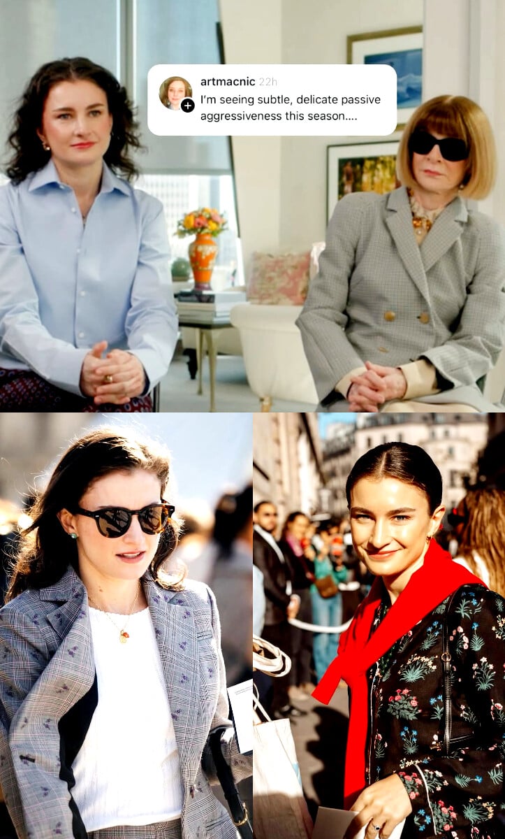 Στο ίδιο κάδρο, η Anna Wintour εμφανίζεται σαν αειθαλής θεότητα του control, ενώ η Chloe Malle σαν άνθρωπος που έχει ξεχάσει να παίζει τον ρόλο της θεότητας. Όλα μοιάζουν με μικρό fashion-rite: η μία ακίνητη σαν εικονίδιο που δεν σηκώνει touch screen· η άλλη ευάλωτη, νευρώδης, γήινη σαν meme που ξαφνικά απέκτησε εξουσία.
