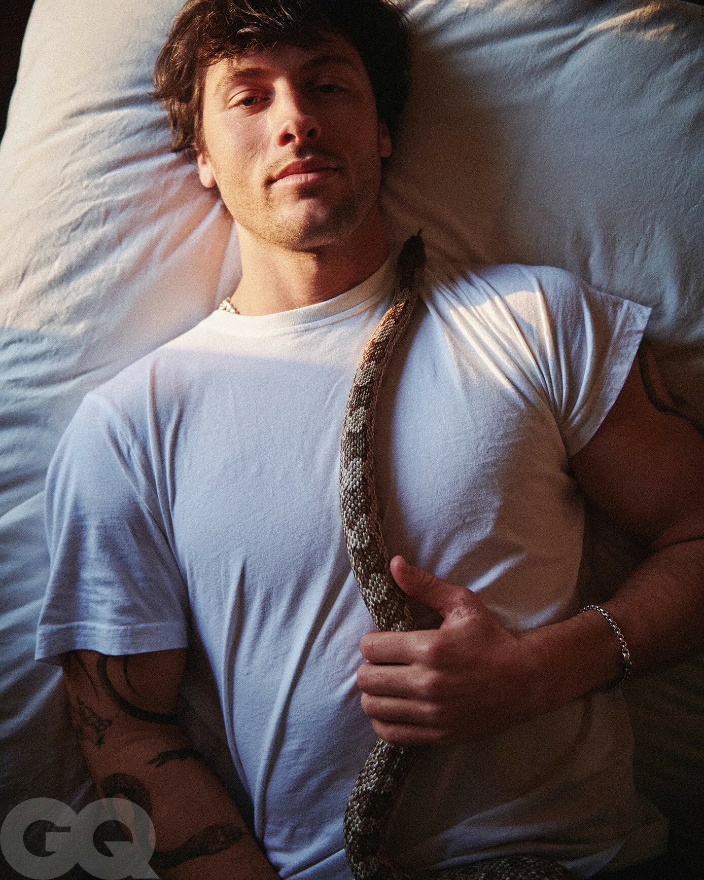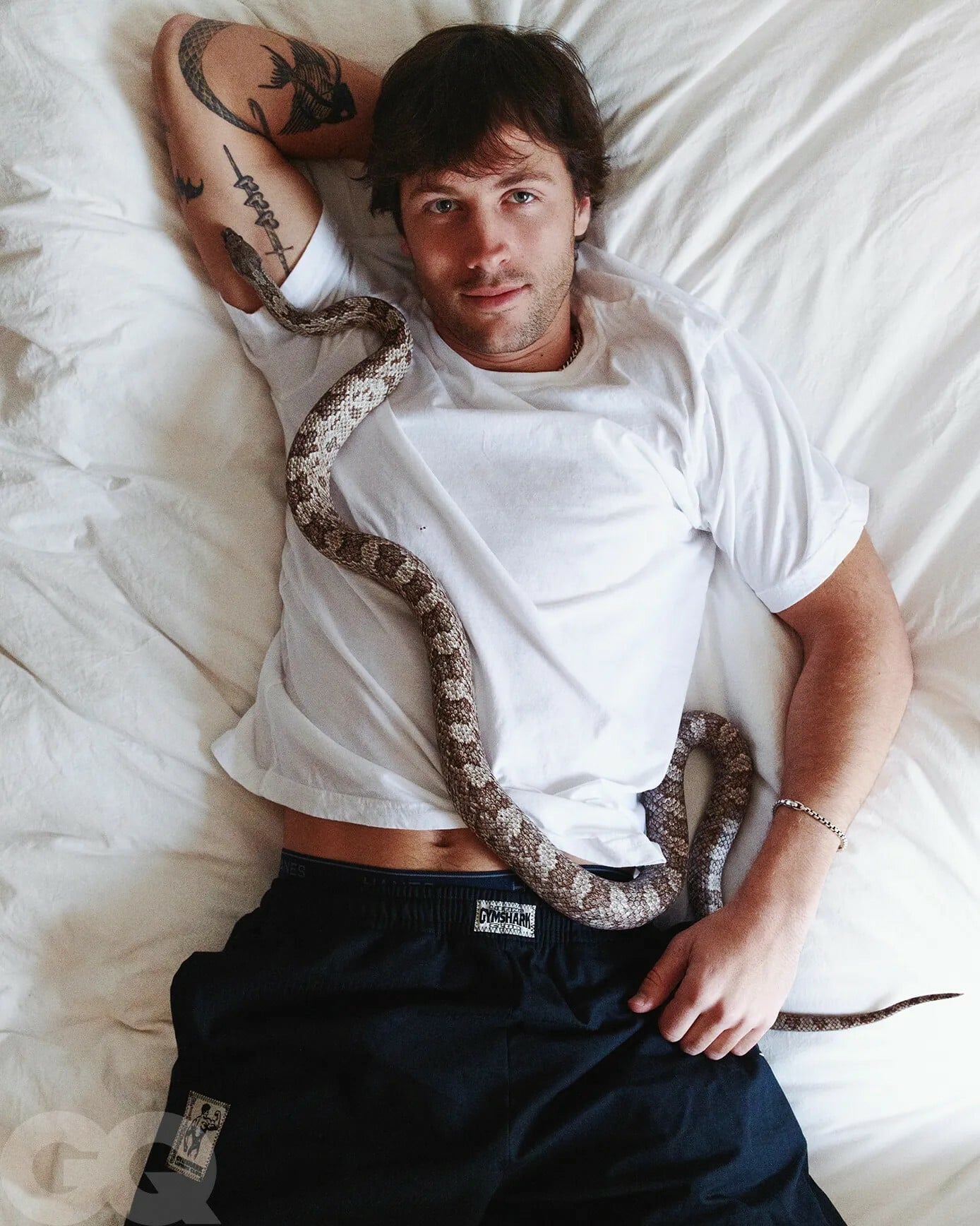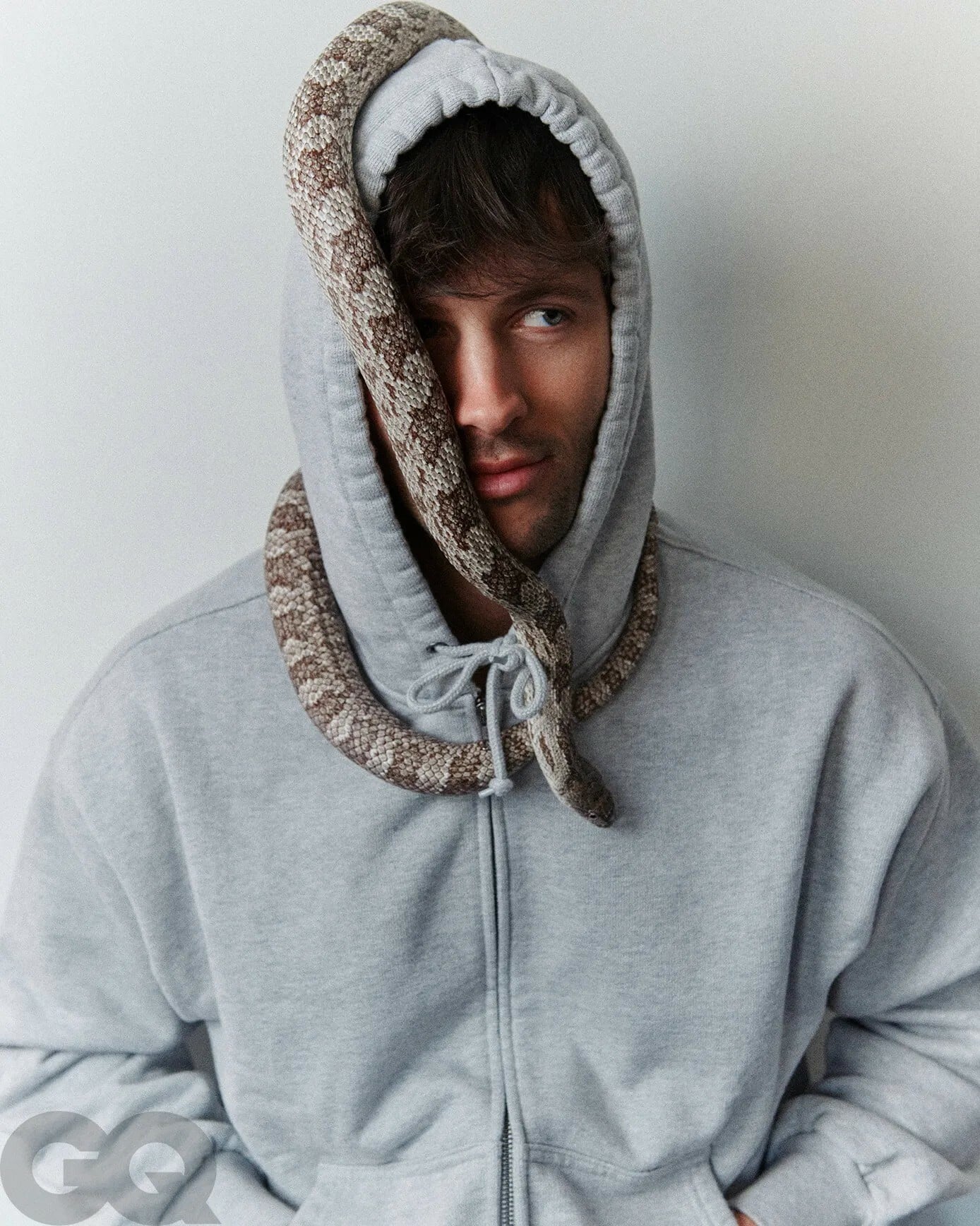 Δεν υπάρχει τίποτα πιο αποτελεσματικό από έναν άντρα που γνωρίζει την ομορφιά του και έχει συμφιλιωθεί τόσο βαθιά με αυτήν ώστε να μη χρειάζεται να την επιδεικνύει, γιατί τότε η ομορφιά παύει να είναι χαρακτηριστικό και γίνεται περιβάλλον, ένα πεδίο βαρύτητας μέσα στο οποίο οι άλλοι κινούνται, εμπιστεύονται, επενδύουν, προβάλλουν, και τελικά παραδίδονται χωρίς να αντιλαμβάνονται ότι η ίδια η εμπιστοσύνη τους έχει ήδη διαμορφωθεί από το πρόσωπο που κοιτούν. Στο Traitors η σιωπή του έμοιαζε με αθωότητα. Στο GQ η ίδια σιωπή αποκτά φολίδες φιδιού.Τον βλέπουμε ξαπλωμένο σε λευκά σεντόνια, το φίδι να γλιστρά πάνω στο στέρνο του, να κουλουριάζεται στον λαιμό του hoodie σαν ζωντανή γραβάτα, να χαράζει μια αργή διαδρομή από τον λαιμό προς την κοιλιά, κι εκεί η εικόνα παύει να είναι styling και γίνεται αλληγορία, γιατί το φίδι δεν είναι ποτέ απλώς φίδι· είναι η υπόσχεση ότι μπορείς να πλησιάσεις κάτι επικίνδυνο και να μη δαγκωθείς — αρκεί να κρατάς σταθερή αναπνοή και να μη φοβηθείς την κίνηση.