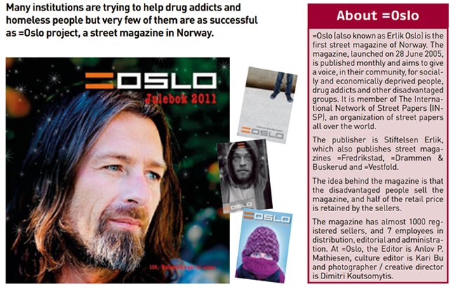 Στο περιοδικό "σχεδία" (τεύχος 3, Μάιος 2013) ο Χρήστος Αλεφάντης υπογράφει ένα κείμενο με τίτλο: «Πότε μιλήσατε τελευταία φορά με ένα πρεζόνι;». Σε αυτό αναφέρεται στην συνάντηση του με τον Δημήτρη Κουτσομύτη art director του νορβηγικού περιοδικού δρόμου «OSLO». Αυτό που κάνει ξεχωριστό το περιοδικό είναι ότι και οι 500 πωλητές του περιοδικού είναι χρήστες σκληρών ναρκωτικών ουσιών. Όχι πρώην, ούτε στην απεξάρτηση. Νυν. Εδώ και τώρα.