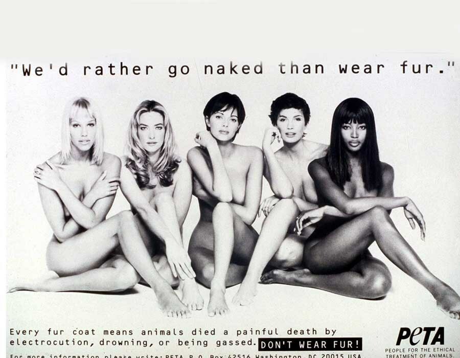"Καλύτερα γυμνή παρά να φορέσω γούνα!" Με αυτό το σλόγκαν και την ολόγυμνη supermodel της εποχής Christy Turlington, έκανε πρεμιέρα η πρώτη μεγάλη καμπάνια της Peta το 1992.