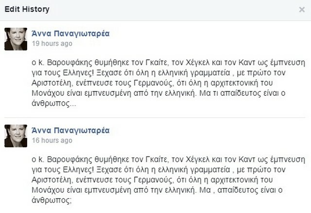 Επίθεση μέσω Facebook στον Γιάννη Βαρουφάκη εξαπέλυσε η Άννα Παναγιωταρέα με αφορμή τις αναφορές του υπουργού Οικονομικών στους Γερμανούς φιλοσόφους κατά τη συνάντηση του με τον Βόλφγκανγκ Σόιμπλε. .