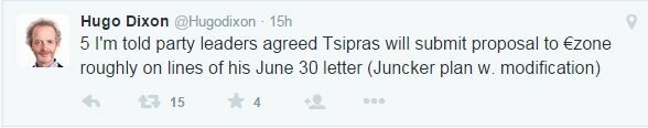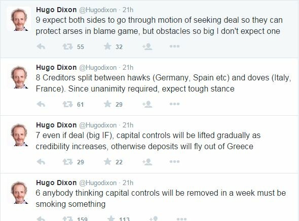 Σε άλλα tweet o Dixon σημειώνει ότι οι δανειστές είναι χωρισμένοι σε ¨γεράκια», όπως η Γερμανία και η Ισπανία και σε «περιστέρια», όπως η Γαλλία και η Ιταλία.