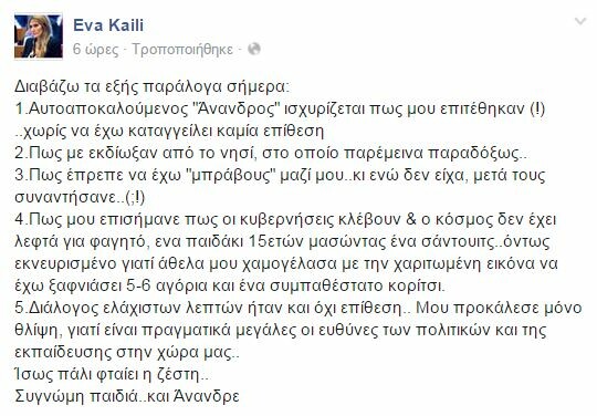 H Εύα Καϊλή απαντά για την επίθεση που δέχτηκε στην Αντίπαρο Facebook Twitter