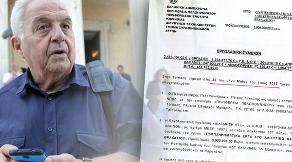 Σύμφωνα λοιπόν με την εργολαβική σύμβαση που δημοσιεύει σήμερα το protothema.gr στις 20 Μαΐου στην Τρίπολη ο περιφερειάρχης Πελοποννήσου Πέτρος Τατούλης και ο 48χρονος εκπρόσωπος της ΔΙΑΤΜΗΣΗ ΑΤΕ Γιάννης Κοτταρίδης συνυπέγραψαν τη συμφωνία για την ανάληψη εκ μέρους της κατασκευαστικής εταιρείας των συμπληρωματικών έργων στο αλιευτικό καταφύγιο Βραχατίου που εντάσσεται στο Επιχειρησιακό Πρόγραμμα Αλιείας 2007 – 2013.