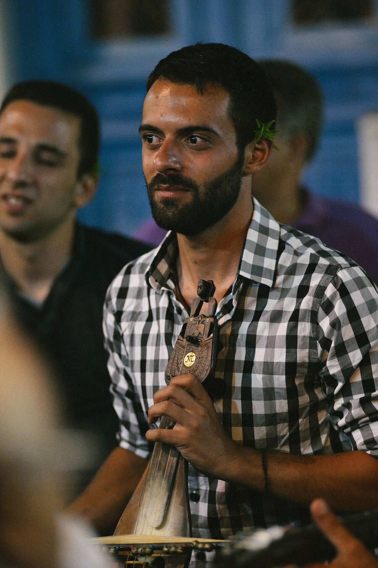 Στην αρχή στήνεται ένα μεγάλο ξύλινο τραπέζι. Πάνω του απλά φαγητά. Ζυμωτό ψωμί, ελιές, κάποιες πίττες. Ντόπια ρακή αλλά και ουίσκι. Γύρω του αρχικά κάθονται λίγοι άνδρες. Οι πρεσβύτεροι του χωριού θα λέγαμε, οι περισσότεροι εξ αυτών εθελοντές ψάλτες στην εκκλησία. Με την συνοδεία τους ο παπα-Γιάννης ξεκινά να ψέλνει. «Πες πως είναι το τραπέζι μετά την κηδεία» μου λέει ένας ντόπιος. Της Θεοτόκου. Υπάρχουν και δυο οργανοπαίχτες. Δωδεκανησιακή λύρα και λαούτο. Σιγά σιγά οι ψαλμωδίες αλλάζουν. Δεν αναφέρονται πια στην Παναγία αλλά σε πράγματα, γεγονότα, πρόσωπα και ιστορίες του χωριού. Αυτοσχεδιαστικά, αλλά πάντα σε ιαμβικό δεκαπεντασύλλαβο, αρχίζουν να μοιάζουν με μαντινάδες. Αν προσέξεις μπορείς να μάθεις τι συνέβη λίγο-πολύ στο χωρίο τον χρόνο που πέρασε. Ή να καταλάβεις ότι μερικοί στίχοι είναι απλώς ανταλλαγή πειραγμάτων και αστείων που ίσως δεν μπορούσαν να ειπωθούν με άλλον τρόπο. Ήσυχα και αργά. Χωρίς ένταση.