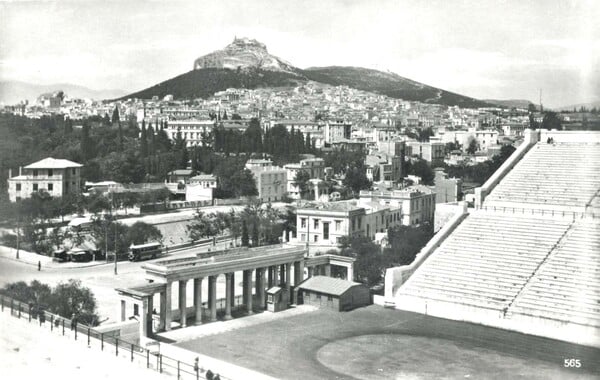 Το Στάδιο με τη γύψινα προπύλαια, που κατασκευάστηκαν για την Μεσολυμπιάδα του 1906 και καθαιρέθηκαν το 1952.