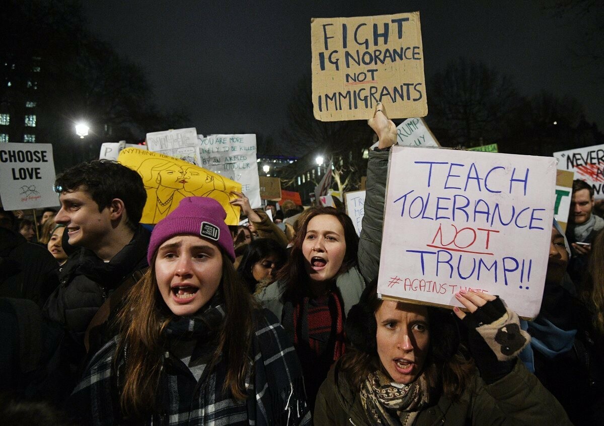 «Όχι στον Ρατσισμό, Όχι στον Τραμπ», «Πετάξτε τον Τραμπ» (Dump Trump),«Είμαστε στο πλευρό των μουσουλμάνων», «Μην δίνετε χέρι βοήθειας σε φασίστες» ήταν μερικά από τα συνθήματα που αναγραφόντουσαν στα πλακάτ. «Ας το φωνάξουμε δυνατά και καθαρά, πρόσφυγες είστε καλοδεχούμενοι εδώ», τραγουδούσε το πλήθος.