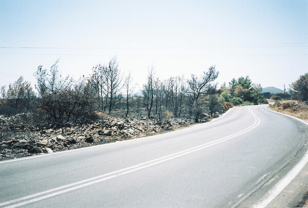 Δεν είχα ξαναβρεθεί ποτέ μου ούτε στα Κύθηρα αλλά ούτε και σε τόπο που έχει βιαστεί προσφάτως από τη φωτιά. Μια πυρκαγιά που τελείωσε πολύ αργά όταν πλέον όλα είχαν εξαφανιστεί και το κάρβουνο έγινε ένα με το σκοτάδι. Σήκωσα τη μηχανή μου και τράβηξα τρία φιλμάκια. Έπειτα σιώπησα. Αυτές είναι και οι μοναδικές φωτογραφίες των διακοπών μου».