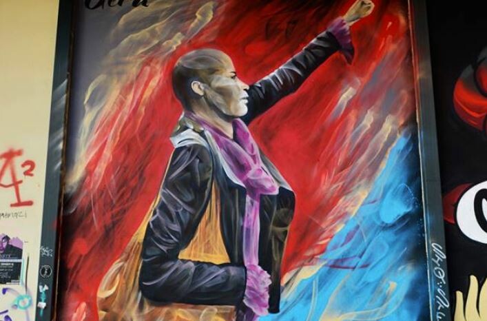Γκραφίτι στον υπαίθριο χώρο της Νομικής Σχολής Αθηνών έγινε η εμβληματική φωτογραφία της ακτιβίστριας Tess Asplund που πριν από έναν περίπου χρόνο απεικονίστηκε με υψωμένη τη γροθιά της να στέκεται μπροστά στους επικεφαλής μιας πορείας περίπου 200 ακροδεξιών εξτρεμιστών στο Borlänge της Σουηδίας.