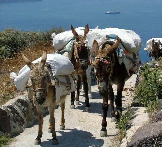 • Ατελείωτες ώρες εργασίας κουβαλώντας τουρίστες κάτω από τον καυτό ήλιο στα 500 σκαλιά της Καλντέρας ή σκουπίδια, μπάζα, και ό,τι άλλο χρήζει μεταφοράς.