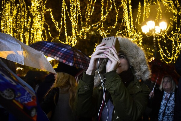 Η βροχή δεν βοήθησε, αλλά τελικά συγκεντρώθηκε αρκετός κόσμος και ο δήμαρχος Αθηναίων Γιώργος Καμίνης έδωσε το έναυσμα και τα χιλιάδες λαμπάκια του δέντρου άναψαν.