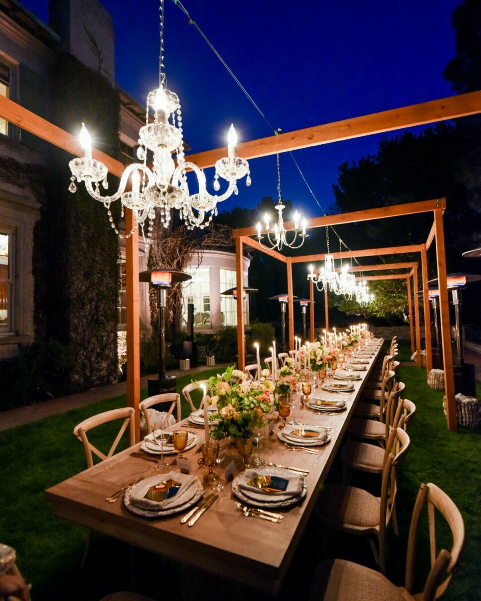 Η οικοδέσποινα της βραδιάς επέλεξε ένα φόρεμα Oscar de la Renta και υποδέχθηκε τους καλεσμένους σε ένα τραπέζι έξω με φωτάκια να κρέμονται από πάνω.
