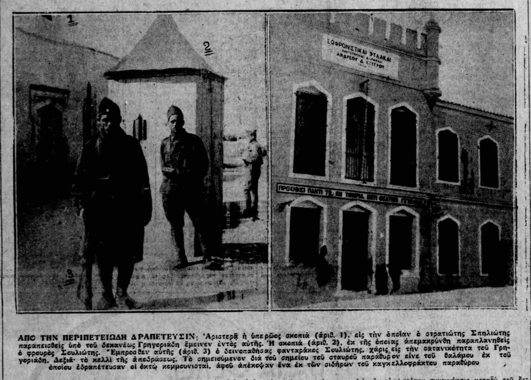 «ΑΠΙΣΤΕΥΤΟΥ ΘΡΑΣΥΤΗΤΟΣ ΠΡΑΞΙΣ συνέβη προχθές την νύκτα εις τας φυλακάς Συγγρού. Κάτι το σπάνιον εις τα χρονικά των φυλακών της χώρας, κάτι που ενθυμίζει απιθάνους αφηγήσεις τρομακτικών αστυνομικών μυθιστορημάτων. Κράμα πνεύματος εκ της φανταστικής αφηγήσεως της αποδράσεως εκ του φρουρίου Ιφ του Μοντεχρήστου και της αρπαγής της βασιλίσσης, απετέλεσε το πλαίσιον εις το οποίον εμελετήθη και εξετελέσθη το θρασύ πραξικόπημα. Πριόνισμα και γκρατσάνισμα του καγκελοφράκτου παραθύρου, αρπαγή και φίμωσις του σκοπού στρατιώτου, στιλπνά περίστροφα μέσα εις την ψυχρή απριλιάτικη νύκτα».