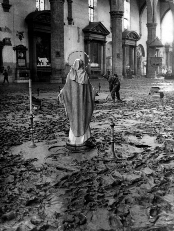 Το πρωί της 5ης Νοεμβρίου 1966, όταν μετά από 40 ώρες η καταρρακτώδης βροχή σταμάτησε, οι πρώτοι εθελοντές και οι κάτοικοι άρχισαν να βγαίνουν στους δρόμους. Η πόλη που φτιάχτηκε με ακρίβεια και ποίηση από τα καλύτερα στοιχεία της Αναγέννησης ήταν ένας βούρκος. Μέσα σε μουσεία, βιβλιοθήκες, πινακοθήκες είχε συμβεί μια αδιανόητη καταστροφή, αφού υπέστησαν ζημιές 120 φρέσκο, 1.200 πίνακες ζωγραφικής, 500 γλυπτά, 6.000 τόμοι βιβλίων από το αρχείο της Όπερας και 1,3 εκατομμύρια σπάνια βιβλία της Κεντρικής Βιβλιοθήκης της Φλωρεντίας.