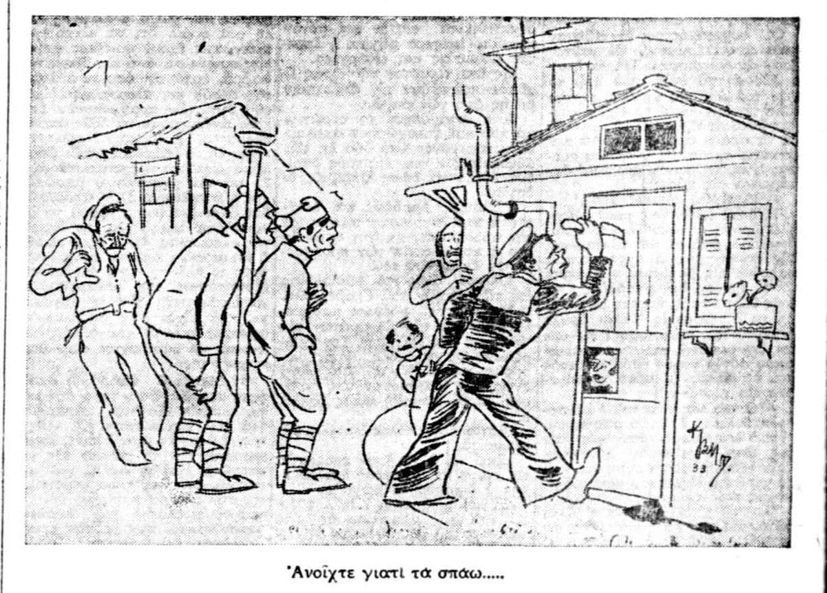Ένας λόχος στρατιωτών ήθελε σώνει και καλά να ανοίξει κάποιο «σπίτι». Η δυστυχισμένη πορτιέρισσα έβγαζε το κεφάλι της από το πορτάκι και προσπαθούσε με το καλό να τους καθησυχάσει, λέγοντάς τους ότι είναι Πάσχα και οι γυναίκες δεν εργάζονται.