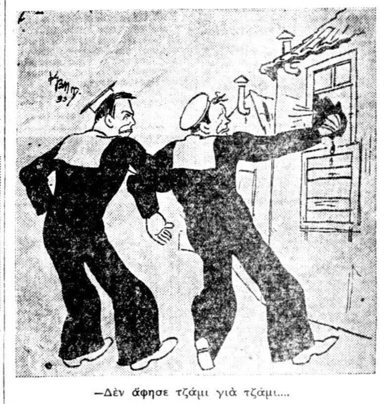 «Ε, το τι επηκολούθησε είναι απερίγραπτο. Ολόκληρα αγκωνάρια έπεφταν στις πόρτες και στα παράθυρα με βρισιές φοβερές. Μια παρέα από τρεις ναύτες ανέλαβε να ξεριζώσει την πόρτα κι ένας άλλος άρχισε να σπάζει τα τζάμια με τις γροθιές του...»