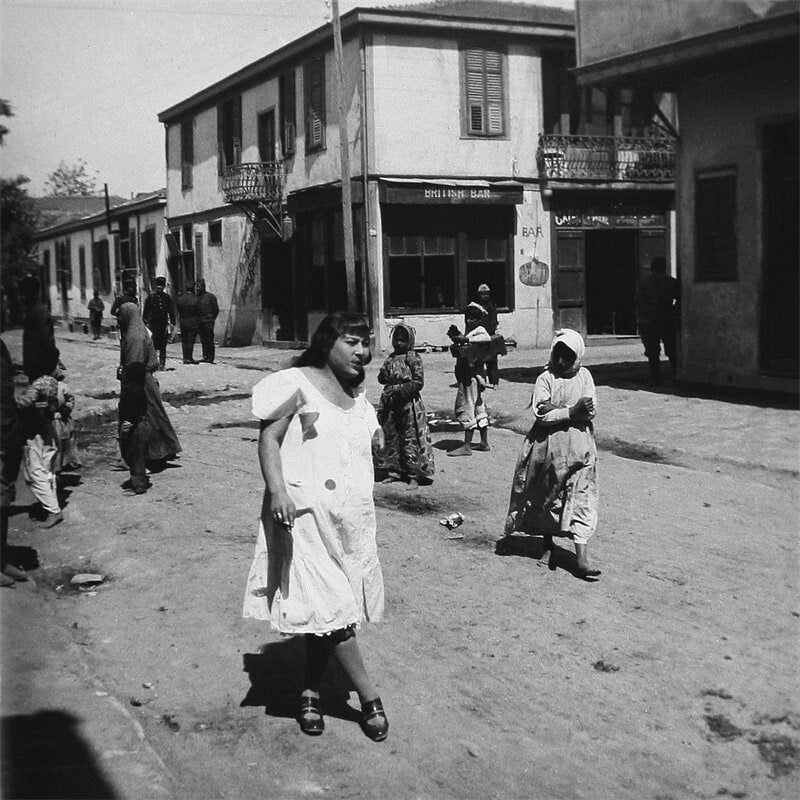 Στο άλλο τετράγωνο, όμως, πόρτες διάπλατες, παραθύρια ορθάνοιχτα, καρέκλες στην είσοδο «κι ένας συρφετός από γυναίκες της αμαρτίας, ή μισόγυμνες ή διπλωμένες σε φανταχτερές ρόμπες, που κάθονταν προκλητικά ή περπατούσαν στα πεζοδρόμια».