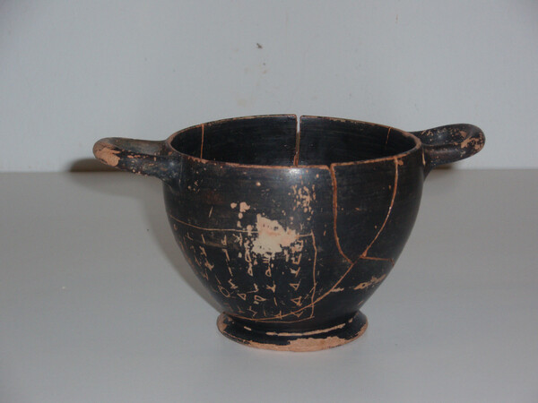 Σε έναν κεραμοσκεπή τάφο, στον οποίο δεν βρέθηκαν οστά, αποκαλύφθηκε ένα μοναδικό και αναπάντεχο εύρημα. Ένα μελαμβαφές πήλινο αγγείο πόσεως (σκύφος, δηλαδή ποτήρι) το οποίο χρονολογείται στο διάστημα από το 480 ως το 465 π.Χ. και το οποίο συνήθως χρησιμοποιούνταν στα συμπόσια. Στην επιφάνεια του αγγείου ήταν χαραγμένα εντός πλαισίου τα εξής ονόματα: