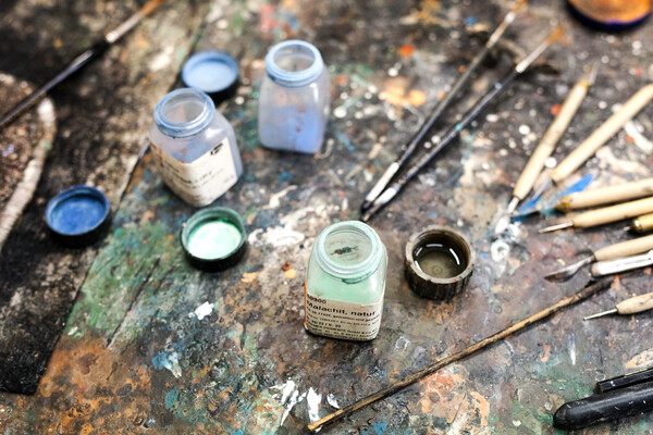 «Μη φοβάσαι». Ήταν η φράση που ακούσαμε τις περισσότερες φορές στο εργαστήριο του Θωμά Κοτσιγιάννη. Εμείς, καθόλου εξοικειωμένοι με το πώς μπορούμε να κινηθούμε σε ένα εργαστήριο αγγειογραφίας, κοιτάζοντας γύρω μας τα τέλεια αντίγραφα, δεν πιάνουμε τίποτα. «Πιάσ' το» μας προτρέπει. «Άγγιξε τη γραμμή, βλέπεις ότι ο μαλαχίτης είναι ανάγλυφο χρώμα; Ακολούθησε με το δάχτυλό σου τη γραμμή των φτερών. Βλέπεις; Είναι μονοκόμματη, δες τη διπλανή, είναι διακεκομμένη σε τρία μέρη, άλλο χέρι».