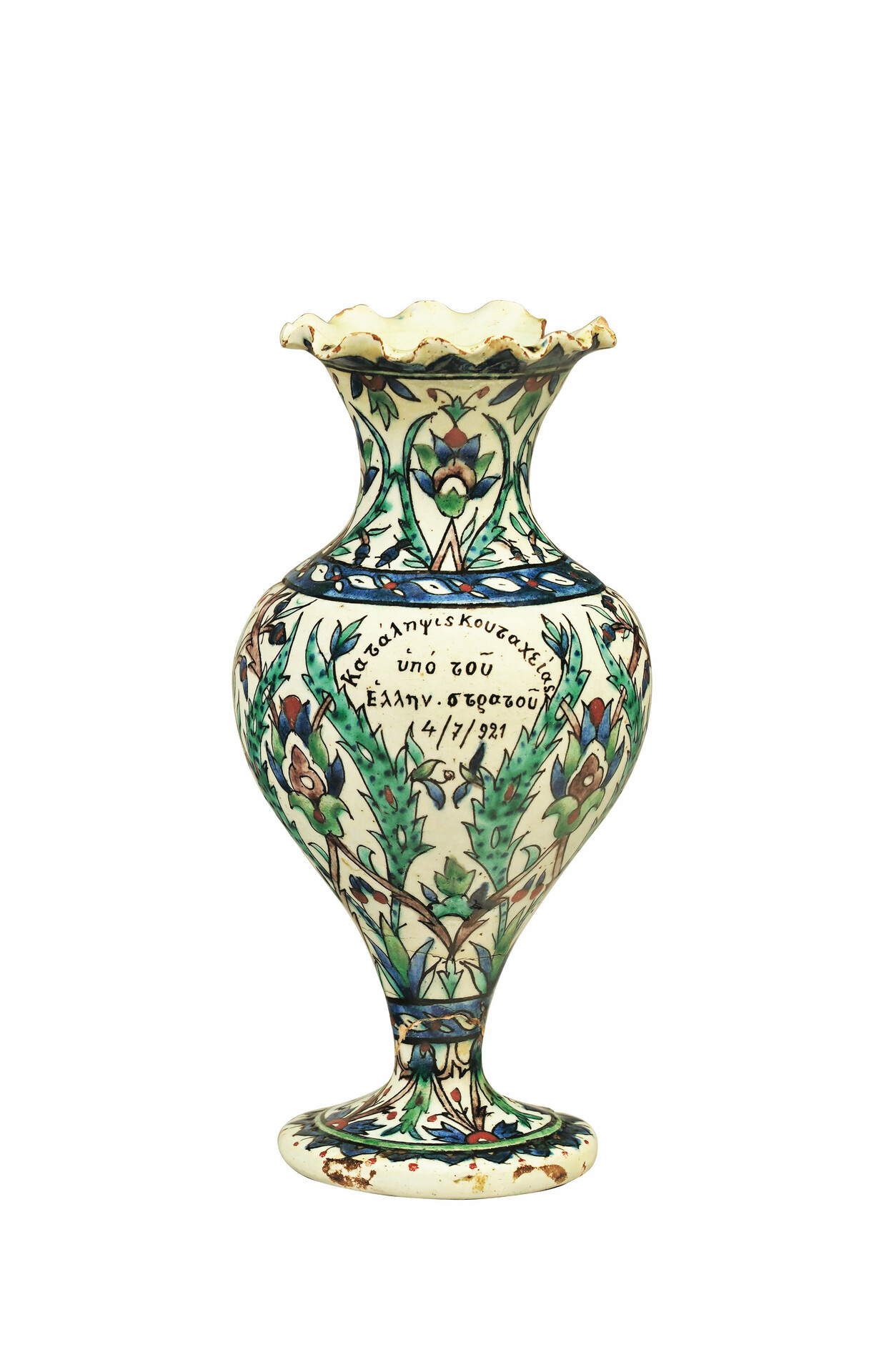 Ενεπίγραφο ανθοδοχείο με τη φράση «Κατάληψις Κουταχείας υπό του Ελλην. στρατού 4/7/921». Το κείμενο πλαισιώνεται από φύλλα σαζ που σχηματίζουν στεφάνι. Κιουτάχεια, Ιούλιος-Αύγουστος 1921. Ύψος: 22,3 εκ.
