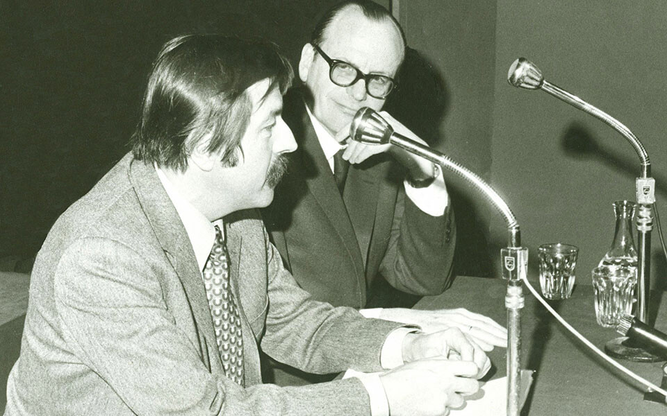 Ο Günter Grass θα μιλούσε στο Θέατρο Άλφα, σε εκδήλωση της ΕΜΕΠ, στις 20 Μαρτίου 1972. Εδώ με τον Γιάγκο Πεσμαζόγλου.