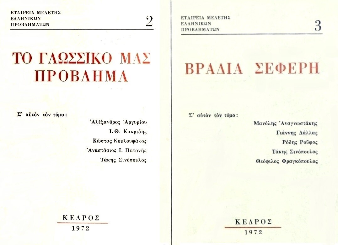 Οι διαλέξεις στο Θέατρο Άλφα «Το γλωσσικό μας πρόβλημα» (1η Νοεμβρίου 1971) και «Βραδιά Σεφέρη» (22 Νοεμβρίου 1971), όπως εκδόθηκαν από τον Κέδρο, το 1972