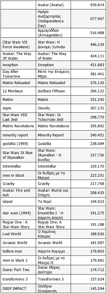 Στην κορυφή, λοιπόν, των μεγάλων επιτυχιών του είδους βρίσκεται με απόσταση από τη δεύτερη το «Avatar», και οι δυο συνέχειές του δεν λείπουν από τις πρώτες 30, όπως άλλωστε φιγουράρουν υπερήφανα τα πρωτότυπα σενάρια του Κρίστοφερ Νόλαν για το «Inception» και το «Interstellar». Το μυστικό τού crossover από ένα πυρηνικό κοινό φανατικών του είδους σε κόσμο που δεν θα είχε πρόβλημα να δει οποιαδήποτε άλλη ταινία είναι να μπουν οι γυναίκες στην αίθουσα, όπως και τα παιδιά, ή να υποστηρίζεται το εγχείρημα από γνωστούς ηθοποιούς. Οι διαστημικές περιπέτειες τύπου «Armageddon», «Ημέρα Ανεξαρτησίας» και «Οι Άνδρες με τα Μαύρα» έχουν αραιώσει σημαντικά, άλλες, όπως το «Jurassic» franchise, χάνουν την ορμή τους, και μόνο το «Dune» κρατά το ενδιαφέρον σε αυξανόμενο βαθμό, τουλάχιστον μέχρι να επανακάμψει ο «Πόλεμος των Άστρων» μιας ακόμη νέας περιόδου. Ο Δημήτρης Κολιοδήμος ανιχνεύει το κοινό που ανέκαθεν υποστήριζε το sci-fi και υποδεικνύει τον χώρο της εγχώριας κριτικής θεώρησης του είδους ως έναν διόλου αμελητέο παράγοντα της παραδοσιακά ισχνής υποδοχής του.