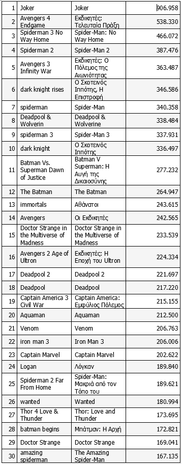 Κι ενώ η κλασική επιστημονική φαντασία καταπιανόταν με τις παραλλαγές που επέκτειναν τις στάνταρ προσλαμβάνουσες της δραματικής περιπέτειας τής (προβληματικής και δραματουργικά πολύπλοκης) κατάκτησης του Διαστήματος, ενέσκηψαν δυναμικά η Marvel και η DC με μια ρελάνς βιομηχανικού όγκου και ασφυκτικής, όπως αποδείχθηκε, ποσότητας, για να μπλέξουν μια ολόκληρη γενιά στα δίχτυα των υπερηρώων, των θανάσιμων εχθρών τους και των αμέριμνων γήινων που παρακολουθούν τις σύγχρονες μεσσιανικές παραβολές με δέος και μια κάποια εξάντληση, μετά από τέτοιο καταιγισμό τίτλων που έπεσαν σαν μετεωρίτες στον 21ο αιώνα, αλλά και των μεταστατικών sequels τους. Κανονικά, ο «ρεαλιστικός» «Joker» του Φίλιπς και του Φίνιξ δεν θα έπρεπε να συμπεριλαμβάνεται στη λίστα, αλλά ο βράχος που τάραξε την κοινωνική λίμνη (θυμόμαστε ακόμη και αποβολές ανήλικων από τις αίθουσες, λόγω… ακαταλληλότητας) φέρει αναγκαστικά το logo και την αιγίδα του Batman, συνεπώς μπαίνει στη λίστα των εμπορικότερων 30, και μάλιστα έχοντας ξεπεράσει τα 900.000 εισιτήρια, και ηγείται με πανηγυρική διαφορά των απανωτών φινάλε των «Εκδικητών» και των πρόσφατων περιπετειών του αγαπητού, όπως εξελίσσεται, Spider-Μan του Τομ Χόλαντ. Εννοείται πως ο Κρίστοφερ Νόλαν ξαναχτυπά και σε αυτήν τη λίστα, και πάλι με δυο ταινίες, φυσικά του «Σκοτεινού Ιππότη».
