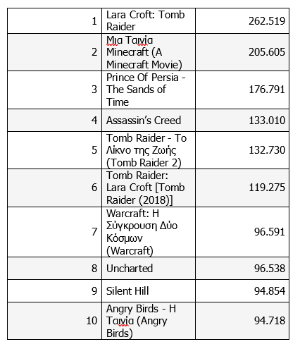 Αν και το πάθος των φαν είναι συχνά συγκινητικό, τα εισιτήρια στη χώρα μας και πάλι δεν συγκρίνονται, γενικά ή ανά ταινία, με την εντυπωσιακή προσέλευση που έχει καταγραφεί στο εξωτερικό, στη φάση της μεγάλης ακμής του είδους. Στην υπερ-κατηγορία που διαφοροποιείται από την επιστημονική φαντασία έρχεται να προστεθεί και εκείνη της μεταφοράς των videogames στο σινεμά. Το top-30 δεν αντέχει σε σοβαρή αξιολόγηση (η παραγωγή είναι αντικειμενικά μικρότερη και οι gamers στη χώρα μας προτιμούν να απολαμβάνουν τη συνήθεια στον προσωπικό τους χώρο), γι’ αυτό παραθέτουμε τη δεκάδα, στην οποία κυριαρχεί η «Λάρα Κροφτ» και με τις τρεις ταινίες στο top-10, φαντάζομαι λόγω Αντζελίνα Τζολί και… Σαντορίνης – η συντριπτική πλειοψηφία που τα είδε μάλλον δεν έχει ιδέα πως βασίζονται στο ομώνυμο videogame, και ίσως καλύτερα…