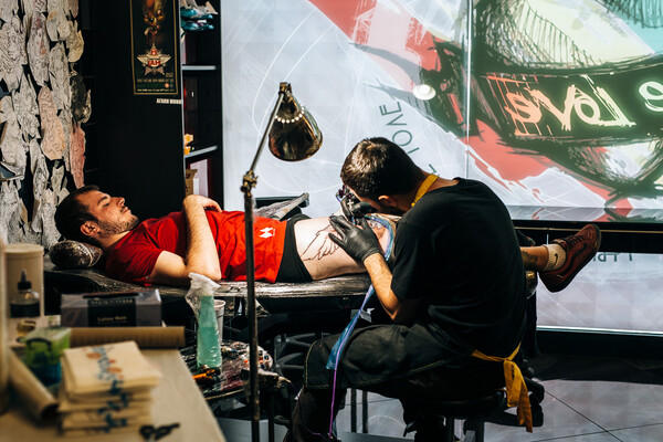 «Ξεκινήσαμε την προσπάθεια άτυπα πριν από τέσσερα χρόνια ενώ σπούδαζα στο Πολυτεχνείο. Μέναμε στις εστίες και αρχίσαμε εκεί να ασχολούμαστε με το tattoo. Δύο τύποι, εγώ και ο Χρήστος Γεωργίου, ένα start up και εκατό ευρώ και κάπως έτσι έγινε το μαγαζί, συν οχτώ τύποι που έχουν στα σκαριά και δεύτερο μαγαζί και όλα αυτά μέσα σε δυόμιση χρόνια. Οι εστίες ήταν κάτι πολύ διαφορετικό, αλλά είναι η βάση για όλο αυτό που γίνεται τώρα. Αυτός ο Mac που βλέπεις πίσω σου», λέει και μας δείχνει περήφανα τον υπολογιστή που χρησιμοποιούν και σήμερα στο μαγαζί, «είναι η πρώτη αγορά που κάναμε». «Ξεκινήσαμε μία σελίδα που την λέγαμε one love. Στην πορεία ήρθε ο Μιχάλης που είναι τώρα μέσα και βαράει tattoo. Θυμάμαι ότι γνωριστήκαμε σε ένα πάρκο και μου είπε για την σελίδα μας, εντελώς τυχαία. Δεν είχαμε στήριξη από πουθενά, ούτε γονείς με λεφτά, ούτε κάτι παρόμοιο. Ξεκινήσαμε από το μηδέν με σχετικά χαμηλές τιμές. Γενικά δεν είχαμε ποτέ σαν στόχο το χρήμα. Ίσως να μας ενδιέφερε πιο πολύ η δόξα, να κάνουμε κάτι που πραγματικά γουστάραμε και να βλέπουμε ότι δίνουμε έμπνευση και σε άλλους ανθρώπους ενώ ήμασταν ακόμη μικροί».