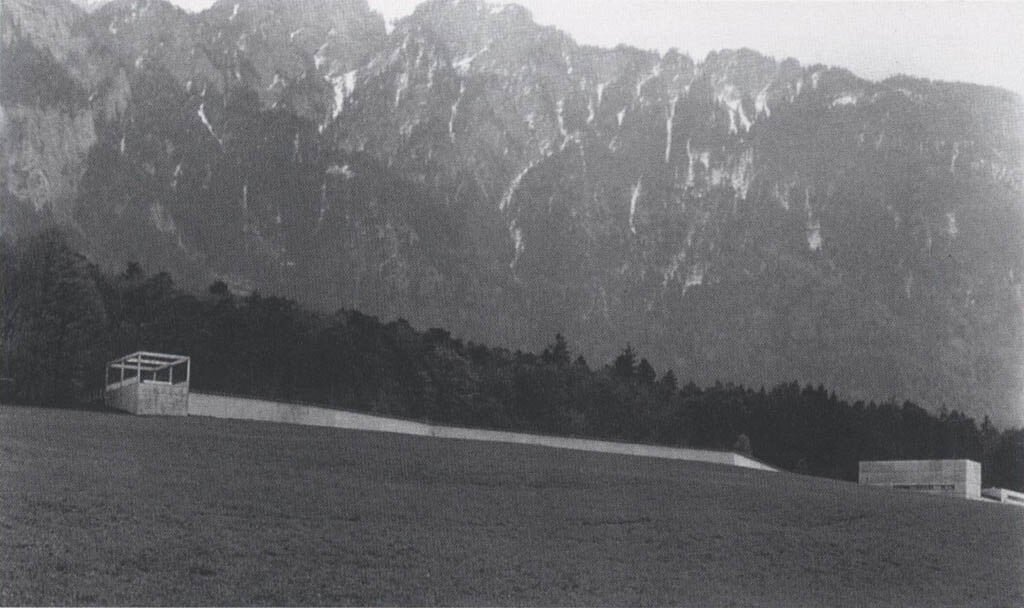 Το νέο τότε (νεκρο)ταφείο έμοιαζε να ξεπροβάλλει από το δάσος που περιβάλλει την πόλη ώς ένα ανυψωμένο αλπικό λιβάδι, οριοθετημένο απο δυο γκρίζους κυβικούς όγκους, έναν πλήρη και έναν κενό.