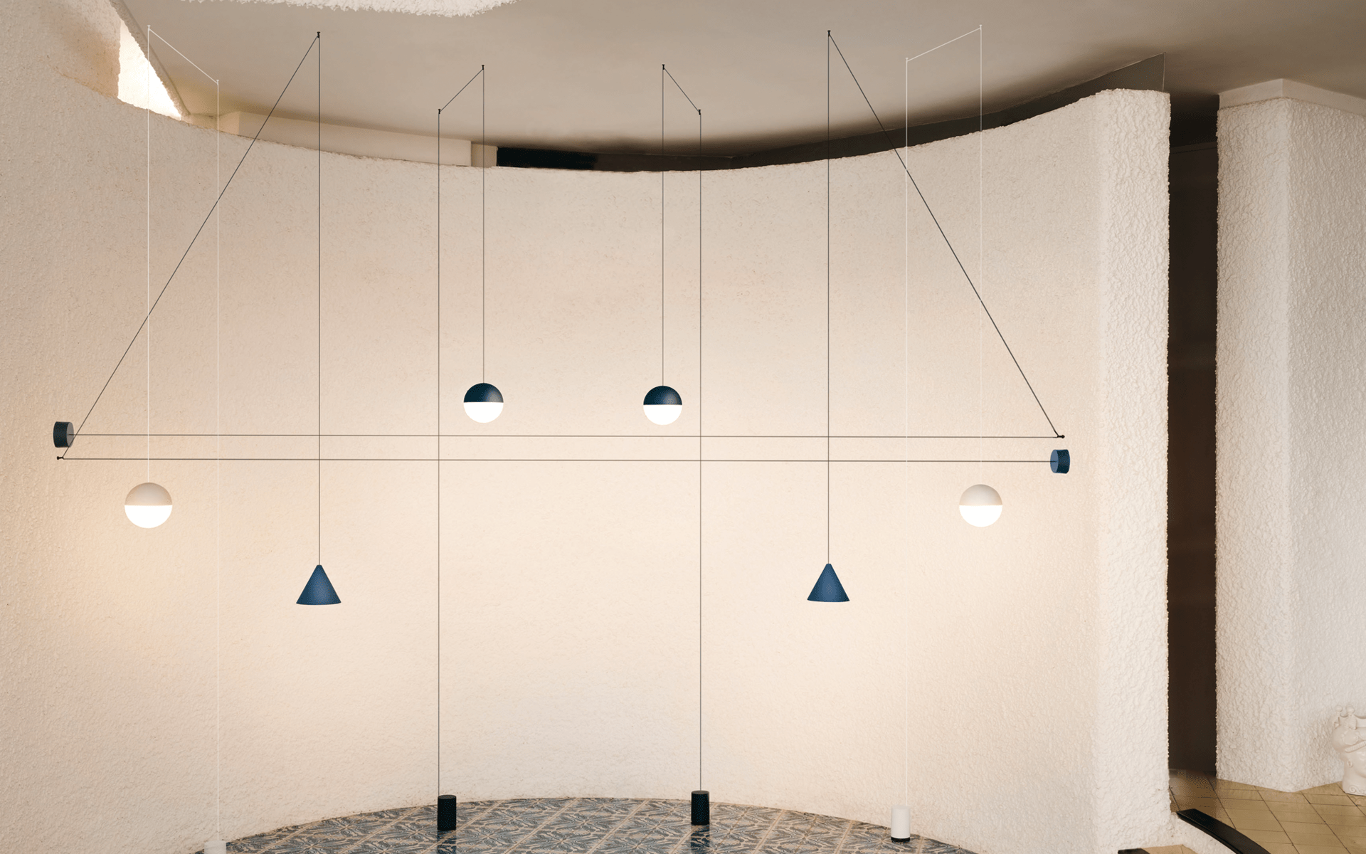 Το Aim είναι το φωτιστικό της εποχής της ευελιξίας. Κρεμαστές λάμπες που ρυθμίζονται σε ύψος και κατεύθυνση μέσω καλωδίων, χωρίς σταθερό κέντρο. Ιδανικό για open plan χώρους, lofts και σπίτια που δεν ακολουθούν παραδοσιακές ιεραρχίες.