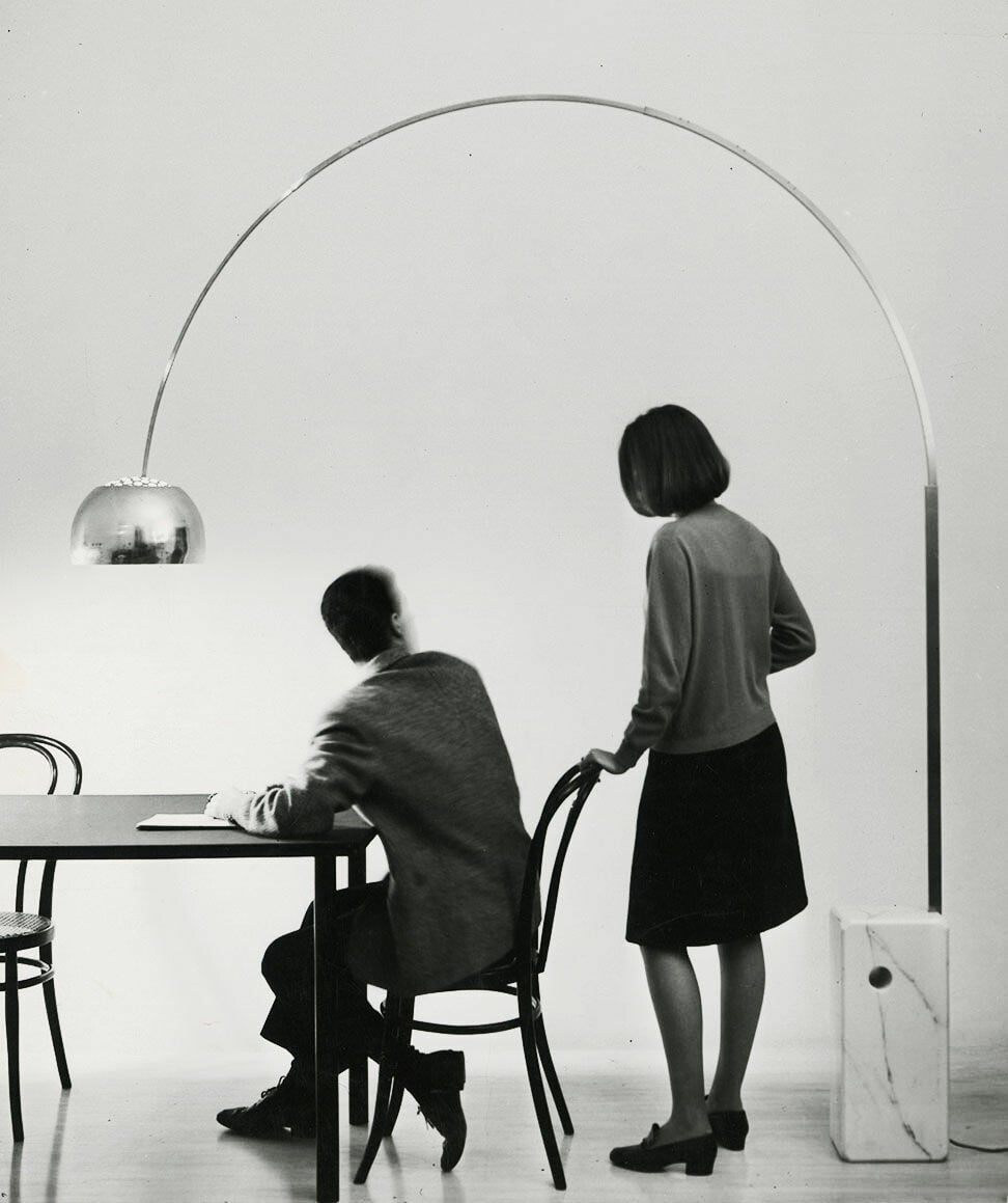 Ίσως το πιο αναγνωρίσιμο φωτιστικό δαπέδου στον κόσμο. Το Arco είναι η απόδειξη ότι ένα φωτιστικό μπορεί να αλλάξει τον τρόπο με τον οποίο ζούμε τον χώρο. Οι Καστιλιόνι δημιούργησαν ένα τόξο φωτός που αντικαθιστά το κεντρικό φωτιστικό χωρίς να απαιτεί τρύπες στο ταβάνι. Βιομηχανικό, έξυπνο, τολμηρό, με μαρμάρινη βάση που λειτουργεί και ως αντίβαρο. Ιδιοφυές.