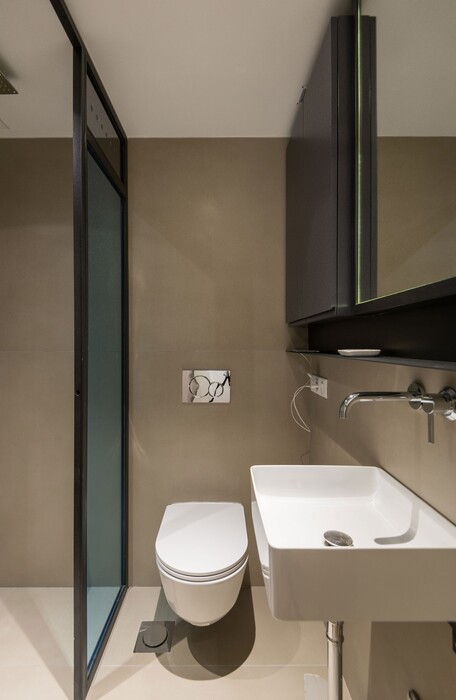Στη θέση του παλιού, μπροστινού σαλονιού έχει διαμορφωθεί ένα master bedroom, με walk-in closet και en-suite μπάνιο που κοιτάζει προς το κρεβάτι και το μπαλκόνι.