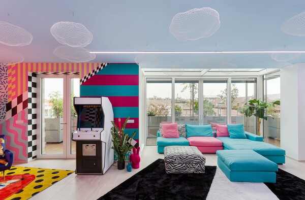 Μοτίβα και χρώματα είναι πανταχού παρόντα στο σαλόνι, όπου οι τοίχοι έχουν χρωματιστεί ώστε να συνδυάζουν ένα μείγμα από ρίγες, ζιγκ-ζαγκ, τρίγωνα και παύλες. Άμορφες μπάλες από λευκό δίχτυ έχουν κρεμαστεί από την οροφή για να μοιάζουν με σύννεφα.