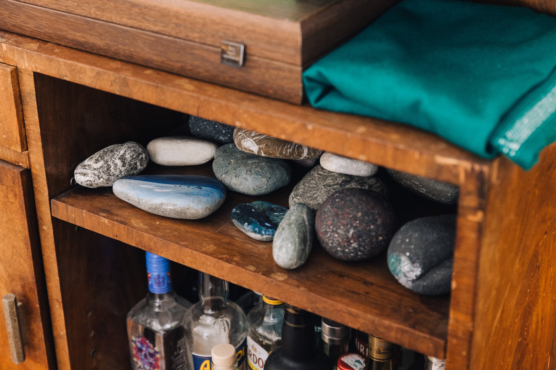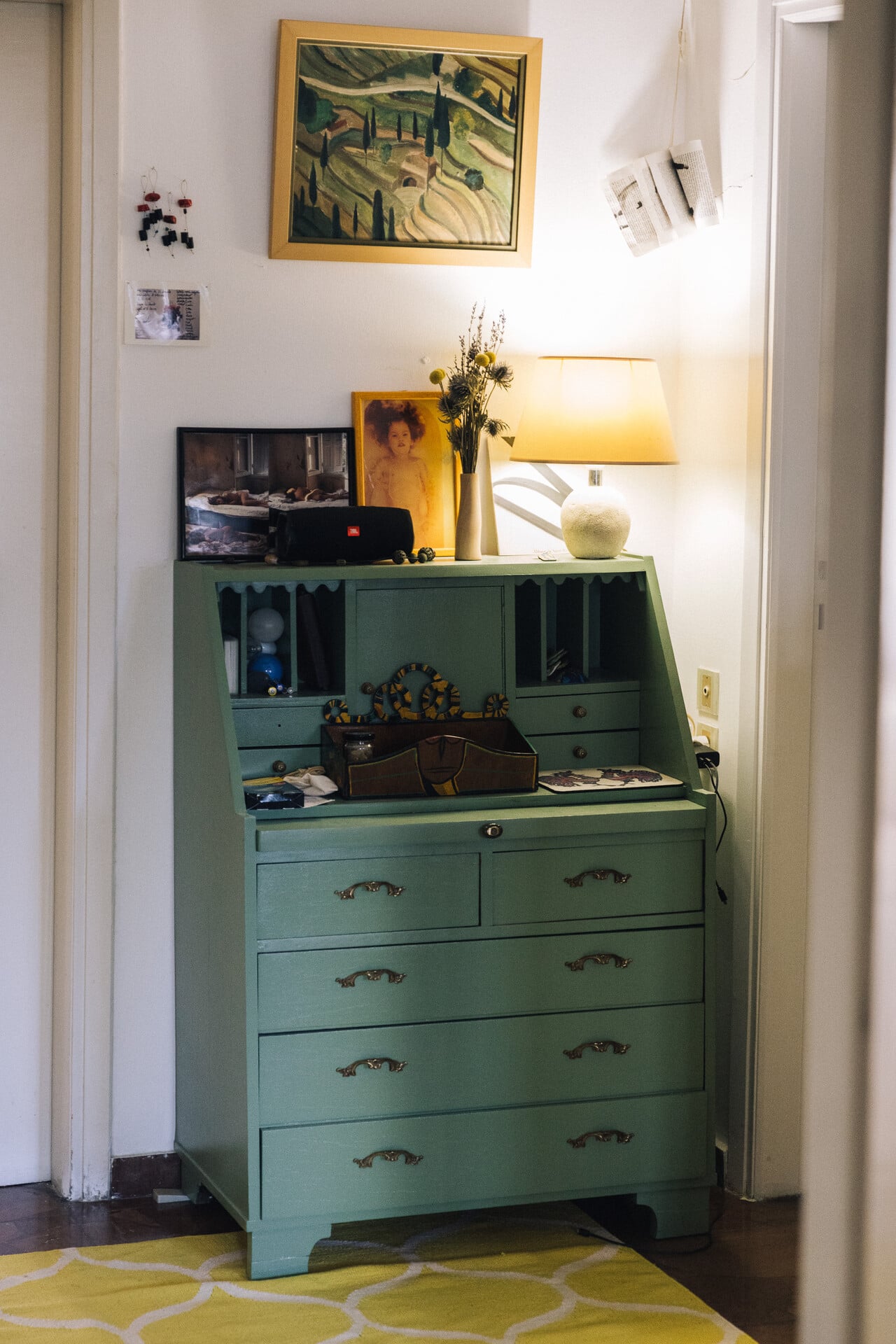 Ένα ωραίο βεραμάν έπιπλο το βρήκε κι αυτό εδώ στο σπίτι. Δεν το ήθελαν, έτσι το έβαψε και μοιάζει σαν καινούργιο, σαν να ’ναι κάτι άλλο από αυτό το αδιάφορο καφέ που δεν έλεγε τίποτα.
