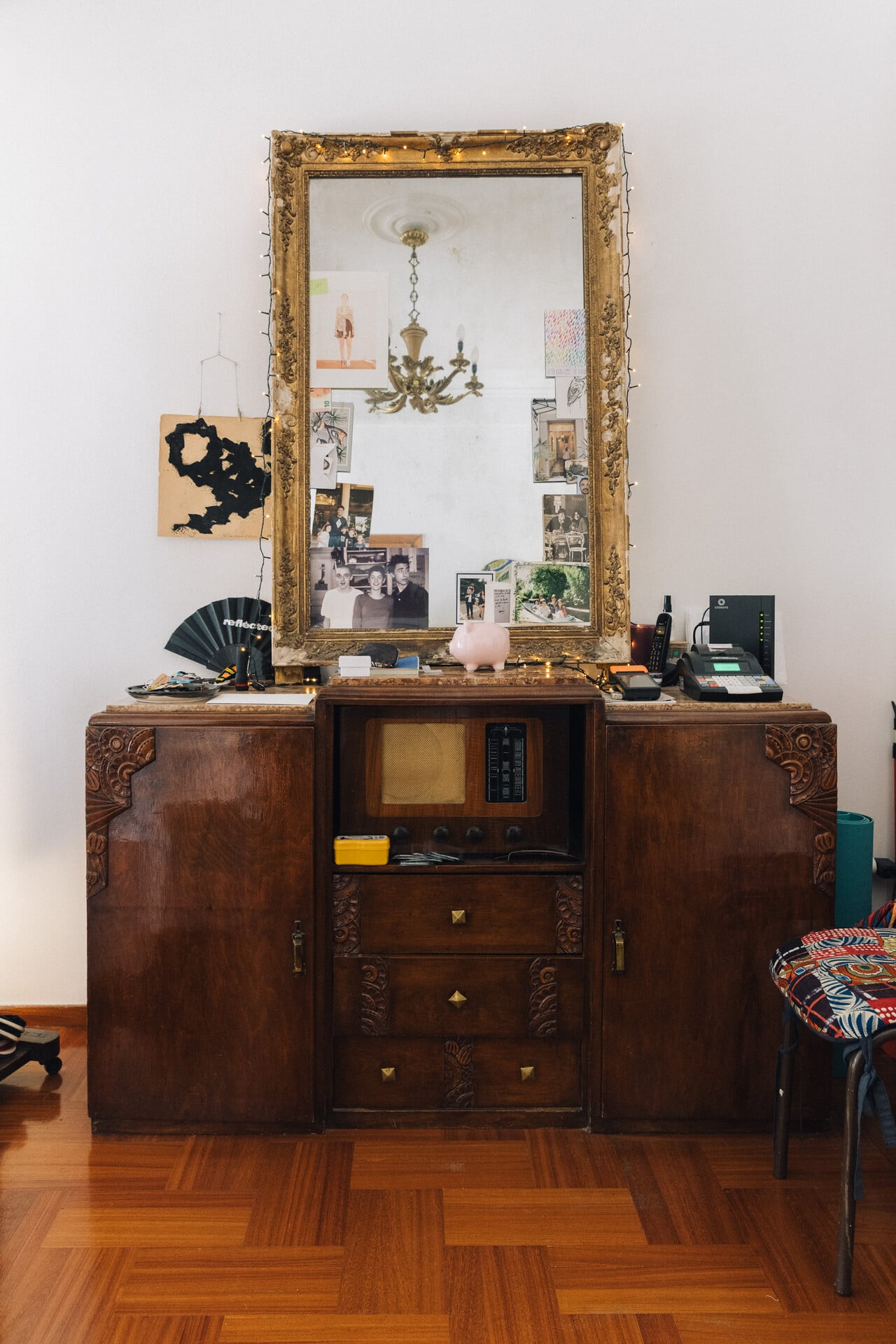 Το τραπεζάκι ήταν της μαμάς της και η Irène έκανε το ψηφιδωτό από πάνω. «Κάνεις και ψηφιδωτά, πέρα από ρούχα και υπέροχα κοσμήματα;» τη ρωτάω και μου κλείνει απλώς το μάτι. Ένα άλλο πολύ παλιό επιπλάκι είναι του 1930, αρ ντεκό. Το έφερε κι αυτό απ’ τη Γαλλία και ενώ θέλει συντήρηση, το αγαπά πολύ.