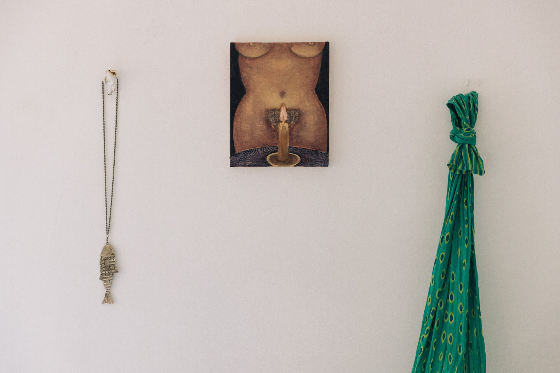 Μου δείχνει κι ένα έργο τέχνης της εικαστικού Κυβέλης Ζώη. «Δώρο στον εαυτό μου», λέει σχεδόν περήφανα.